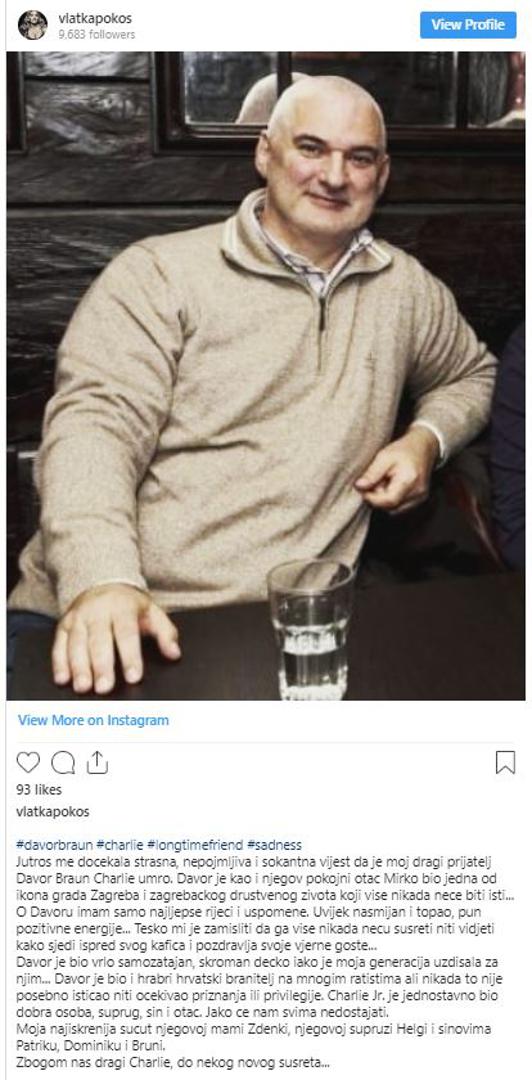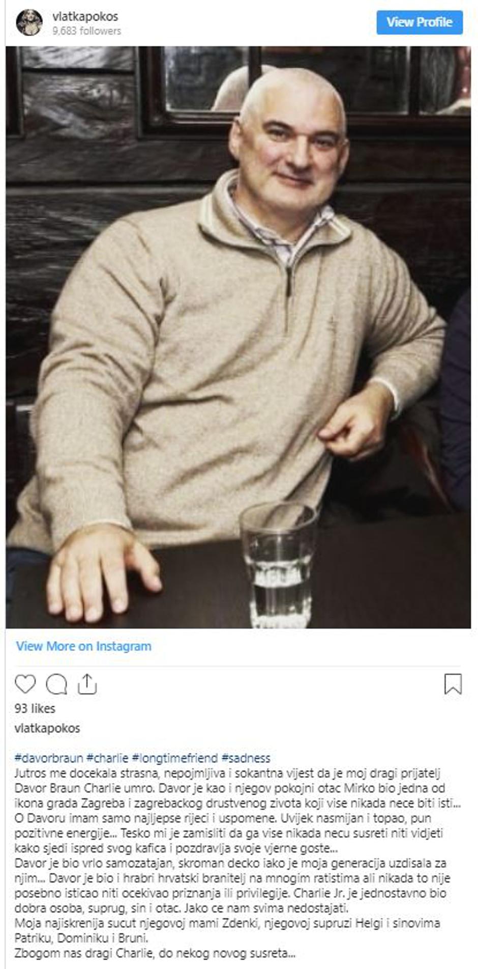 "Jutros me dočekala strašna, nepojmljiva i šokantna vijest da je moj dragi prijatelj Davor Braun Charlie umro. Davor je kao i njegov pokojni otac Mirko bio jedna od ikona grada Zagreba i zagrebačkog društvenog života koji vise nikada neće biti isti... O Davoru imam samo najljepše riječi i uspomene. Uvijek nasmijan i topao, pun pozitivne energije... Teško mi je zamisliti da ga više nikada neću susreti niti vidjeti kako sjedi ispred svog kafića i pozdravlja svoje vjerne goste...", započela je Pokos.