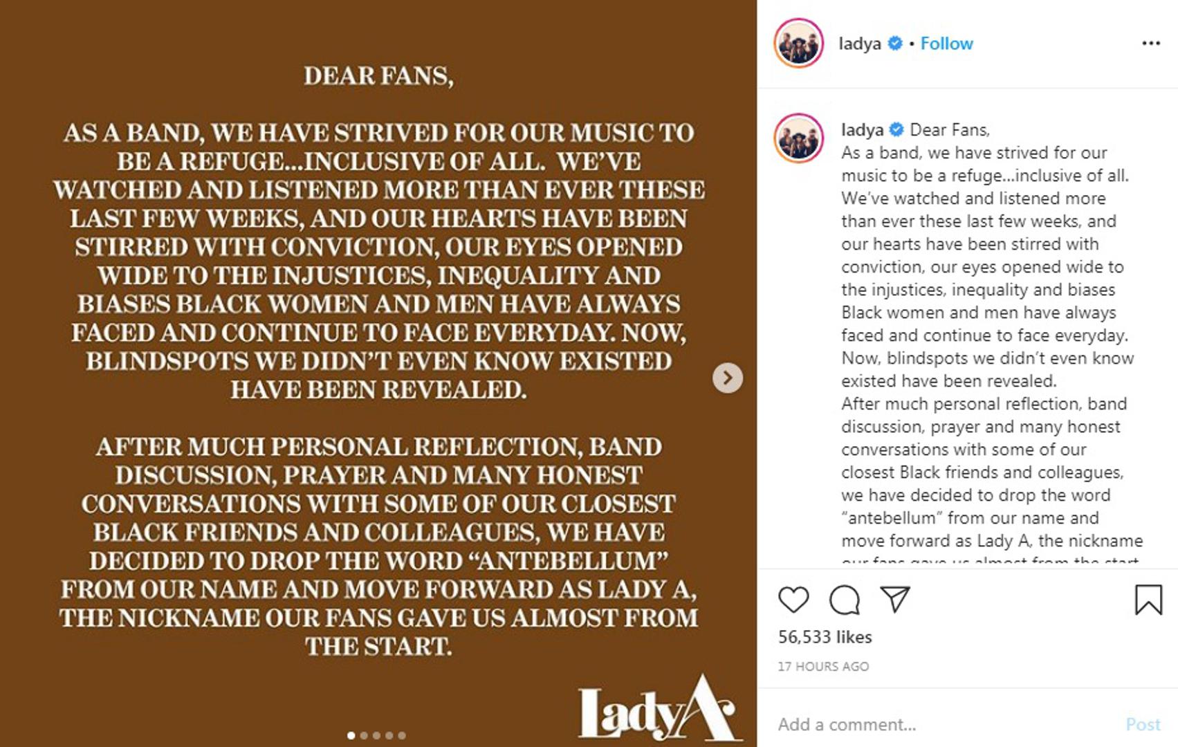 Band osnovan u Nashvilleu 2006., poznat po hitovima poput "Need You Now" za koji je dobio Grammy, pojasnio je da je ime promijenjeno kao odgovor na masovne prosvjede zbog rasizma u SAD-u, potaknute smrću crnca Georgea Floyda.