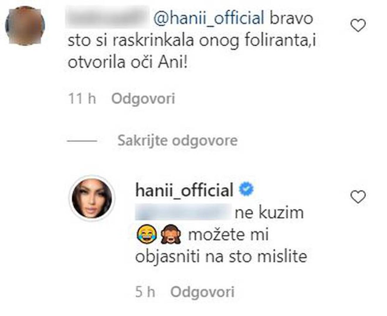 Hana je nakon ovih glasina na svom Instagramu ostavila sljedeću poruku: Ne mogu zaustaviti glasine i ne mogu promijeniti mišljenje ljudi koji vjeruju u njih. Sve što mogu je sjediti i smijati se ljudima kojima nemaju ništa bolje za raditi nego pričati o meni. Goran je svoj profil na Instagramu zaključao i ne osvrće se na ove glasine. Hana je podijelila s obožavateljima novu fotografiju na kojoj svima nalikuje na Kim Kardashian, sudeći po komentarima ispod fotografije.