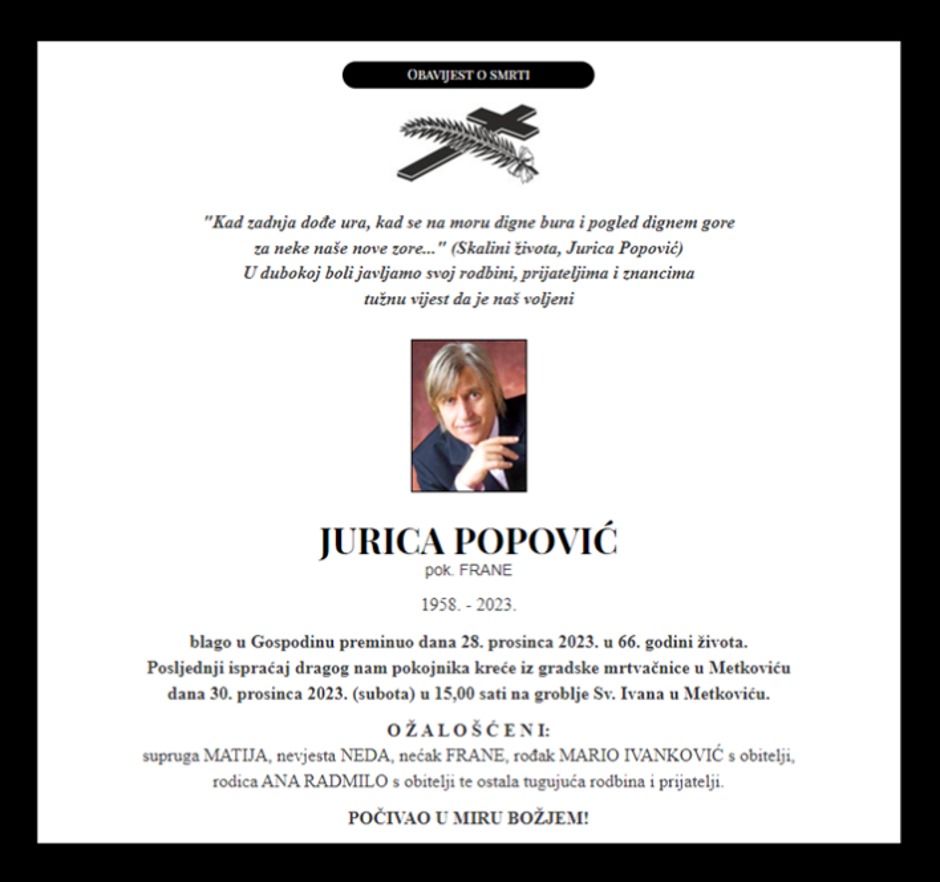 Podsjetimo, u prošlog četvrtka hrvatsku je javnost šokirala vijest o iznenadnoj smrti glazbenika Jurice Popovića. Njegova partnerice i jedna od najpoznatijih domaćih dizajnerica Matija Vuica istog je dana objavila na društvenim mrežama dirljivi status, koji nikog nije ostavio ravnodušnim. – Ljubavi moja, idemo našoj kući – napisala je Matija uz njihovu nasmijanu fotografiju na kojoj poziraju uz instrumente i uživaju u glazbi. Nakon toga, objavljena je i osmrtnica Jurice Popovića. - Posljednji ispraćaj dragog nam pokojnika kreće iz gradske mrtvačnice u Metkoviću dana 30. prosinca 2023. (subota) u 15,00 sati na groblje Sv. Ivana u Metkoviću – pisalo je u obavijesti.