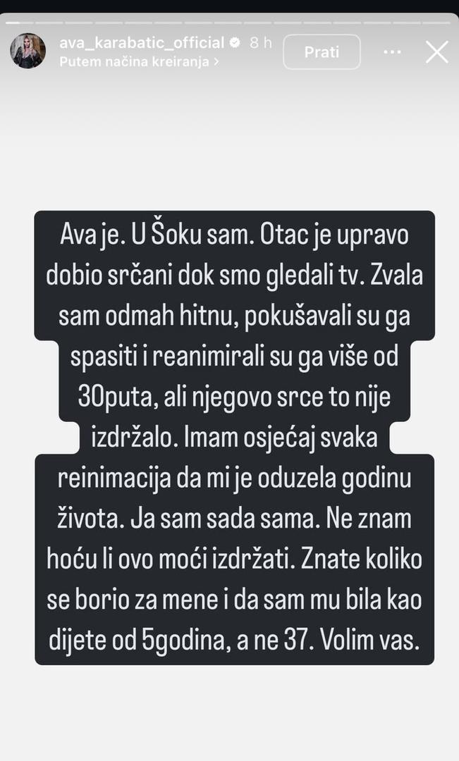 ''U šoku sam, otac je upravo dobio srčani dok smo gledali TV. Zvala sam odmah hitnu, pokušali su ga spasiti i reanimirali su ga više od 30 puta, ali njegovo srce to nije izdržalo'', napisala je Ava, vidno slomljena i potresena gubitkom, a zatim je dodala: