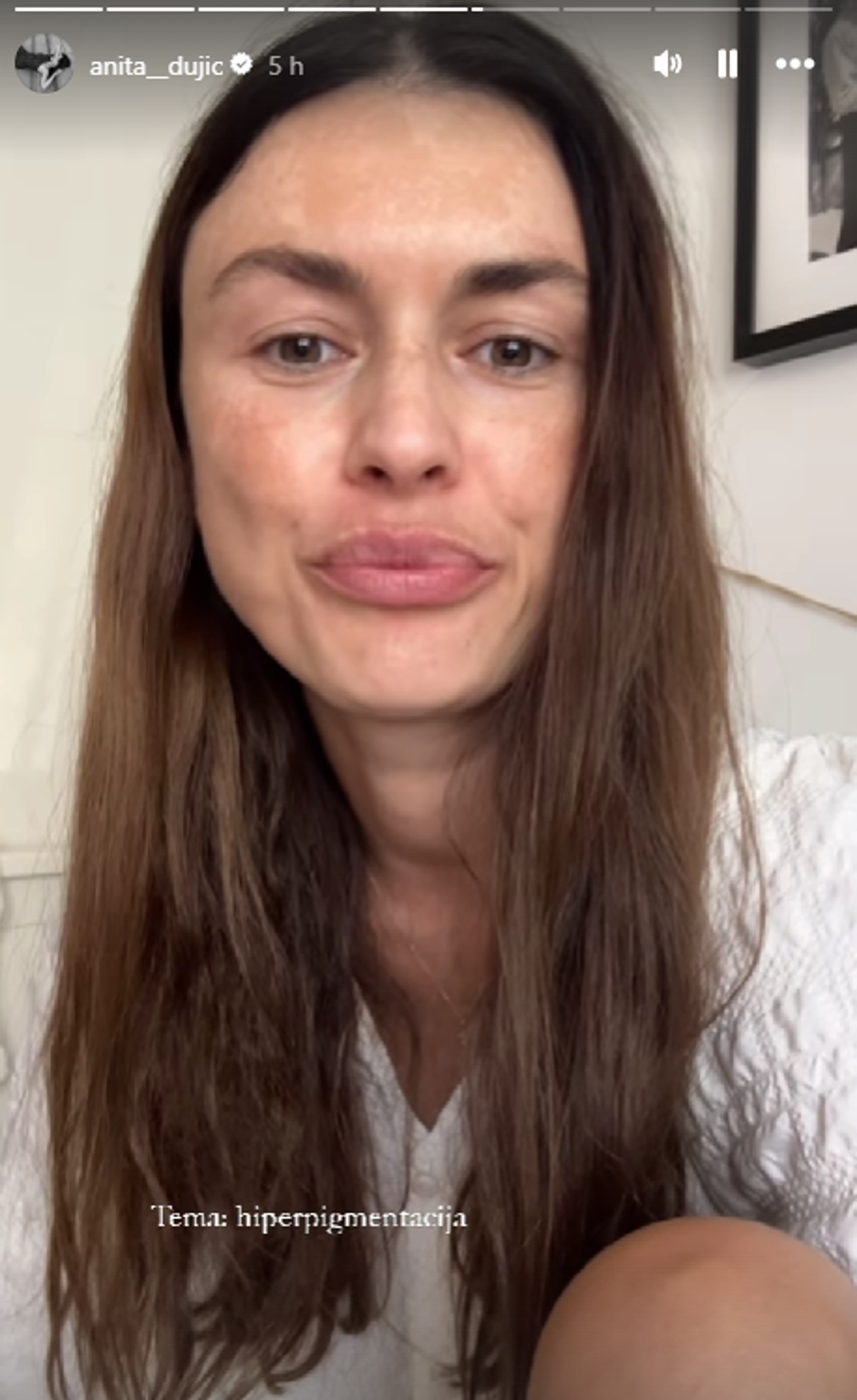Bivša hrvatska manekenka Anita Dujić Broadfoot aktivna je na društvenoj mreži Instagram gdje dijeli detalje iz privatnog, ali i poslovnog života. Ovaj je put Anita podijelila s prijateljima stanje s kojim se već dugo bori. Naime, riječ je o posljedicama hiperpigmentacije, odnosno poremećaja boje kože što uključuje tamne mrlje. - Snimam se bez ikakvog filtera, bez make up-a, nemam apsolutno ništa na licu, osim kreme koju sam stavila jutros kad sam se probudila, sad je tri sata. Uglavnom, za sve vas koji mi pišete za hiperpigmentaciju, jesam li je se riješila i kako sam je se uspješno riješila, nisam. Evo ovo je stanje moje kože po ljeti. Ona posvijetli po zimi - priznala je odmah na početku videa na Instagramu.