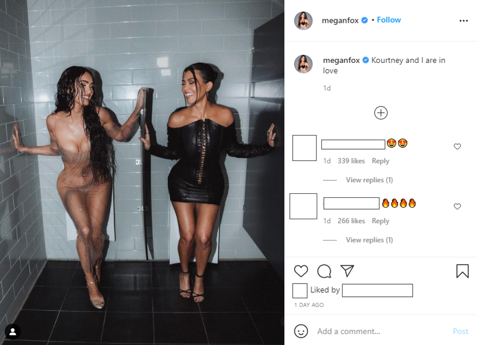 Glumica Megan Fox (35) i reality zvijezda Kourtney Kardashian (42) na dodjeli MTV nagrada digle su prašinu jednom objavom na društvenim mrežama. Poznate dame iskoristile su mogućnost da ovjekovječe trenutak na svoj način, pa su odlučile pozirati u muškom toaletu. Glumica i reality zvijezda pozirale su iznad pisoara oponašajući sjedeći položaj te su zatvorile oči i smiješile se. "Kourtney i ja smo zaljubljene", napisala je u opisu fotografije glumica. Fotografiju je i Kourtney objavila na društvenim mrežama, a prikupila je velik broj lajkova. Ona je na svojem Instagram profilu objavila i fotografiju na kojoj se obje na istom mjestu ljube sa svojim dečkima: Megan s glazbenikom Machine Gun Kellyjem, a Kourtney s Travisom Barkerom.