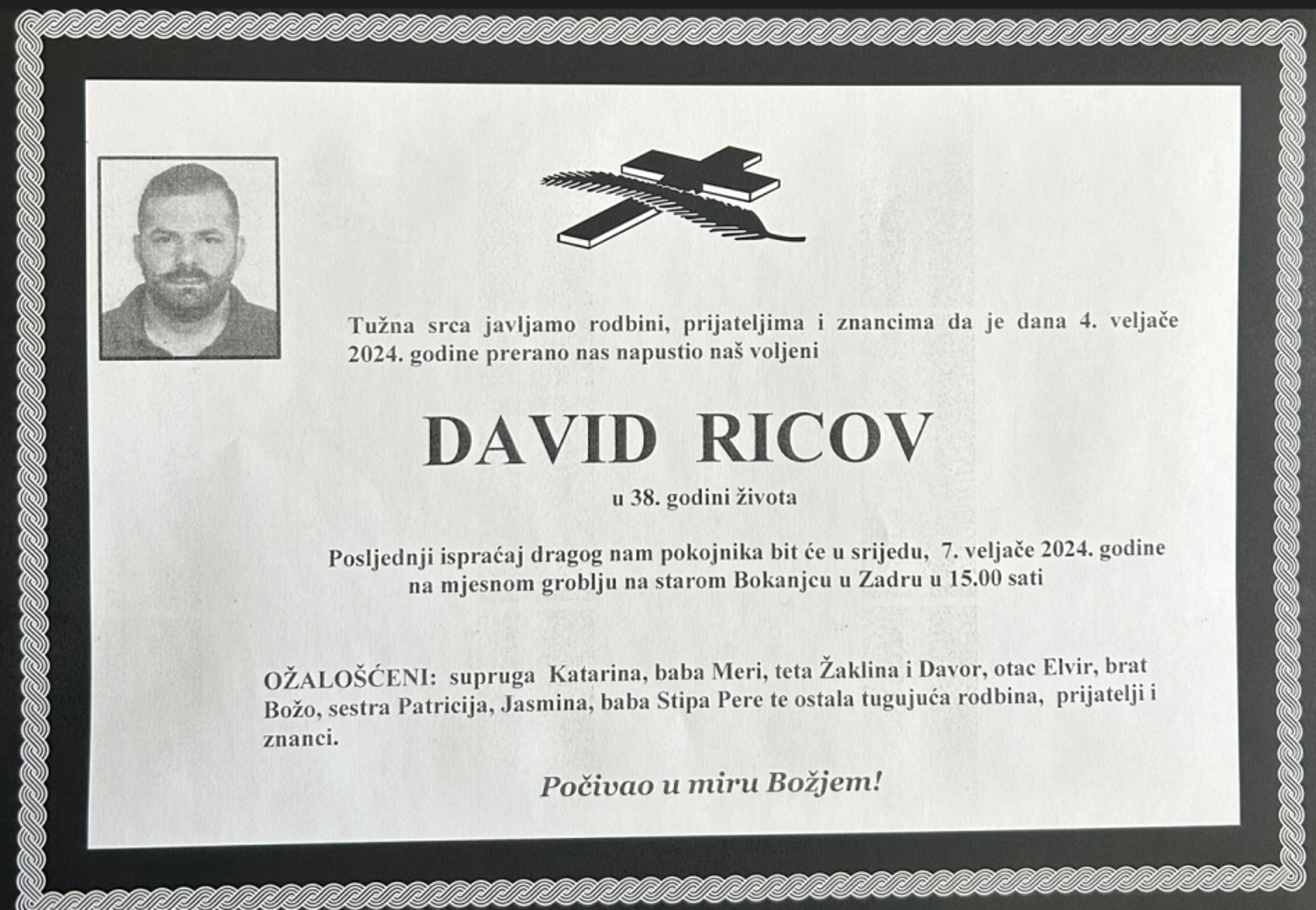 "Tužna srca javljamo rodbini, prijateljima i znancima da je dana 4. veljače 2024. godine prerano nas napustio naš voljeni David Ricov. Posljednji ispraćaj dragog nam pokojnika bit će u srijedu, 7. veljače 2024. godine na mjesnom groblju na starom Bokanjcu u Zadru u 15 sati. Ožalošćeni: supruga Katarina, baka Meri, teta Žaklina i Davor, otac Elvir, brat Božo, sestra Patricija, Jasmina, baka Stipa Pere te ostala tugujuća rodbina, prijatelji i znanci. Počivao u miru Božjem", piše u osmrtnici.