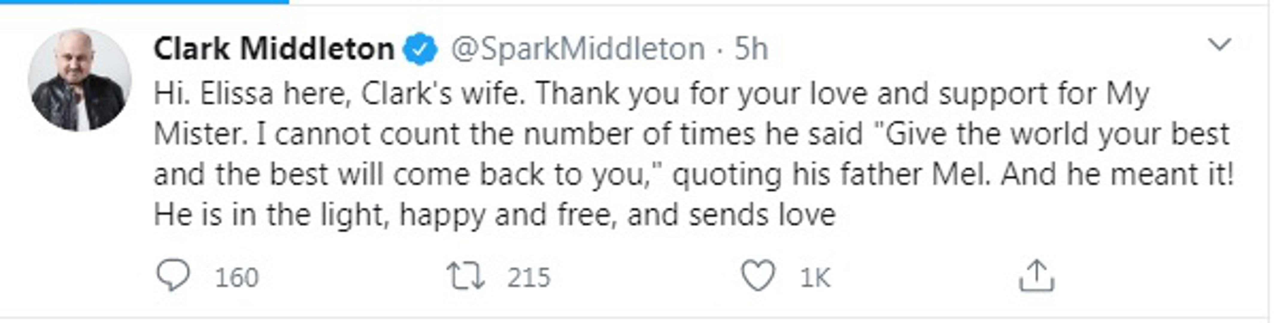 - Teška srca objavljujemo odlazak života koji je izuzetno vrijedan proslave: Clark Tinsley Middleton, 63 - voljeni glumac, književnik, redatelj, učitelj, heroj, suprug, svjetionik, prijatelj. Clark je preminuo od posljedica virusa Zapadnog Nila. Bio je divna duša, čovjek koji je cijei život prkosio granicama i zagovarao parava osoba s invaliditetom, stoji u objavi.