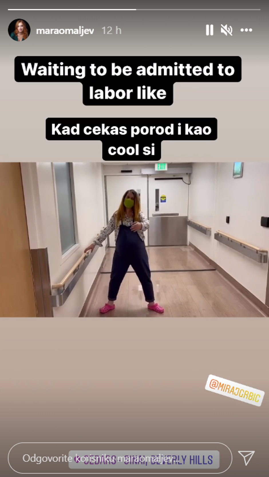 Glumica Marija Omaljev na svojem Instagramu je objavila video iz bolnice Cedars Sinai na Beverly Hillsu. Glumica je pokazala da se nalazi na čekanju poroda, a svoje je pratitelje počastila i videom u kojem nosi trudničke hlače na tregere, masku za lice i papuče. "Kad čekaš porod i kao cool si", napisala je uz objavu.