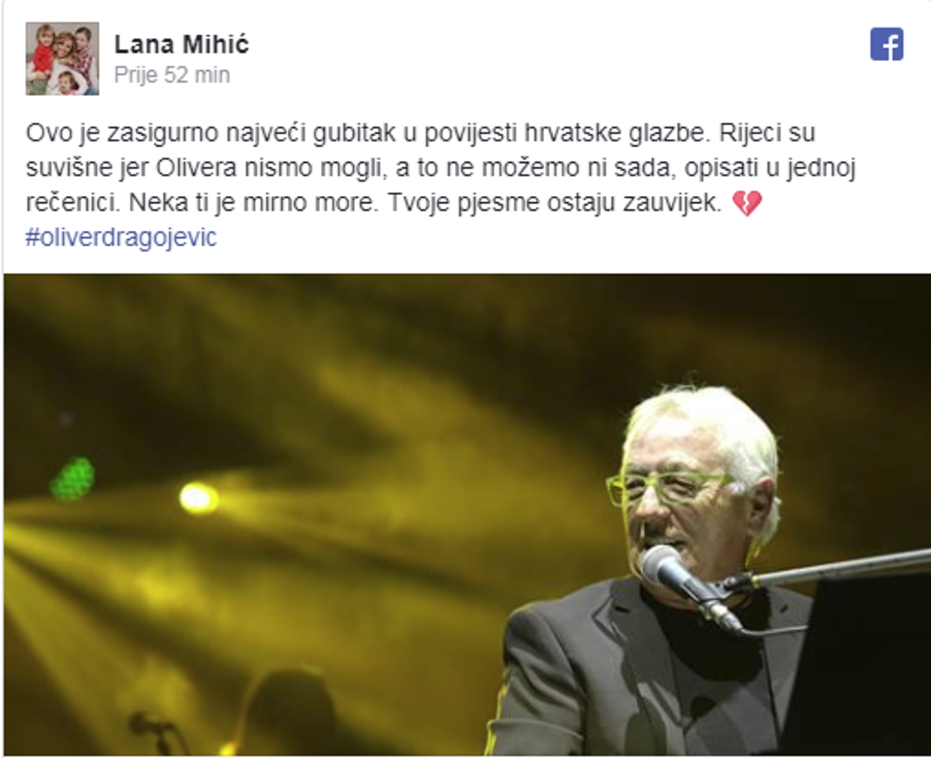 'Nikoga nisam voljela i poštovala kao njega, nikoga nisam slušala toliko kad sam bila tužna i sretna, na ničije koncerte nisam voljela i htjela ići kao na njegove' izražava sućut Lana Jurčević podsjećajući da Oliver nikada neće biti zaboravljen.