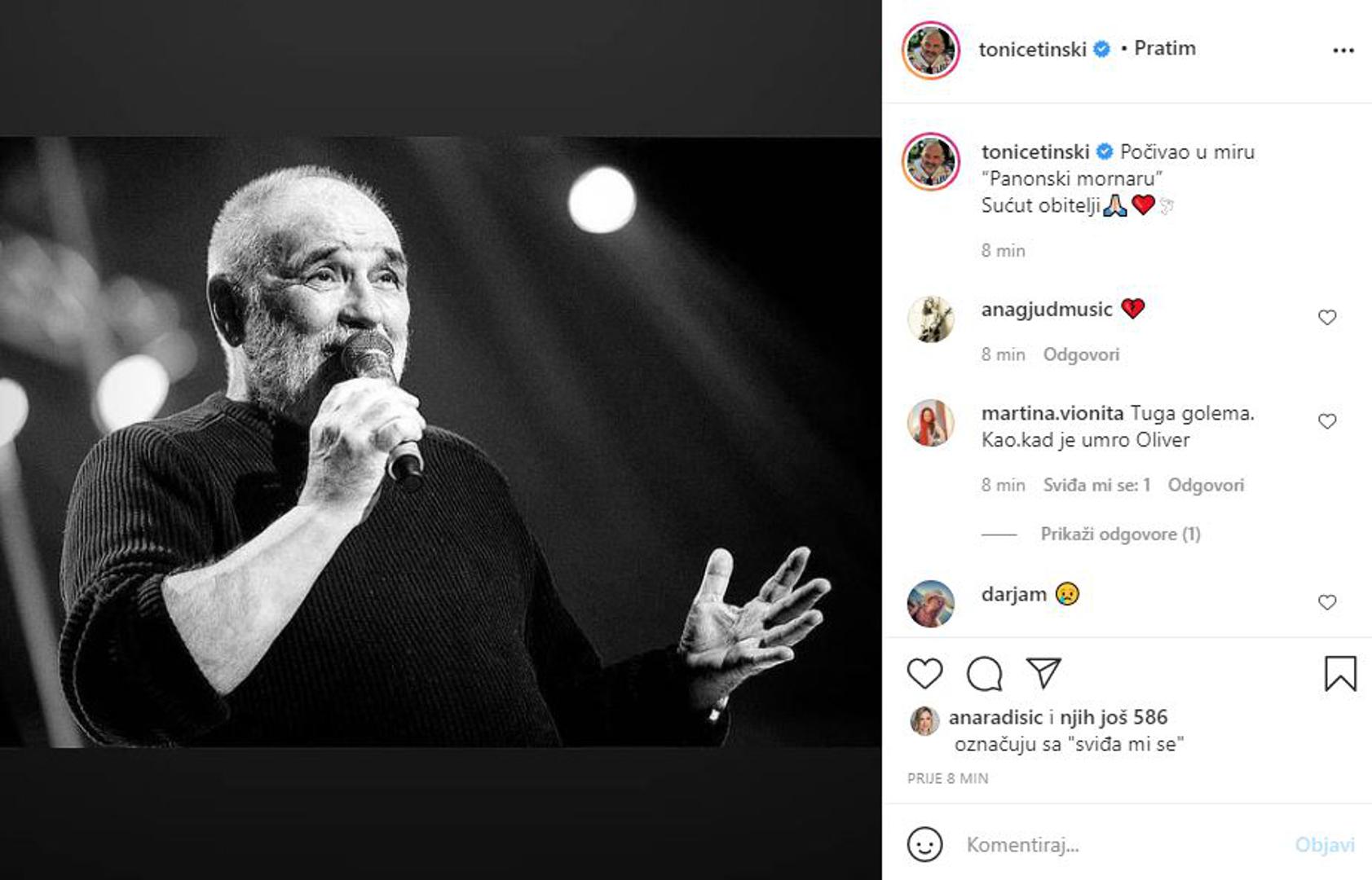 Glazbenik Toni Cetinski također se oprostio od Đorđa. "Počivao u miru “Panonski mornaru”, Sućut obitelji", napisao je.