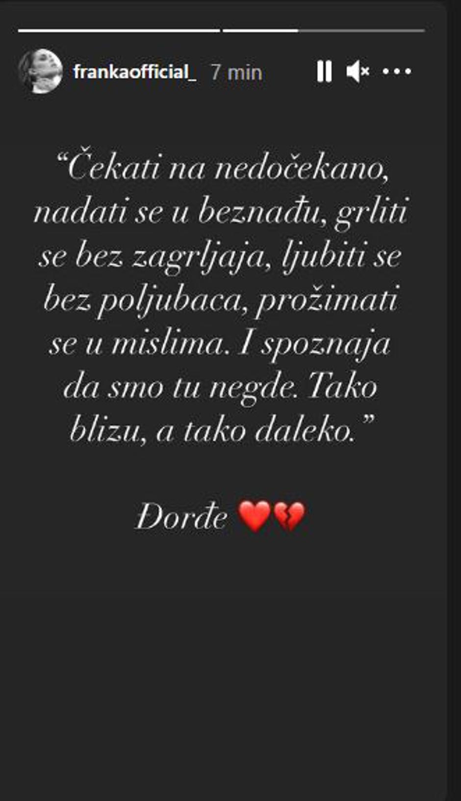 "Čekati na nedočekano, nadati se u beznađu, grliti se bez zagrljaja, ljubiti se bez poljubaca, prožimati se u mislima. I spoznaja da smo tu negde. Tako blizu, a tako daleko.", napisala je Franka i dodala "Đorđe" s emotikonima srca.