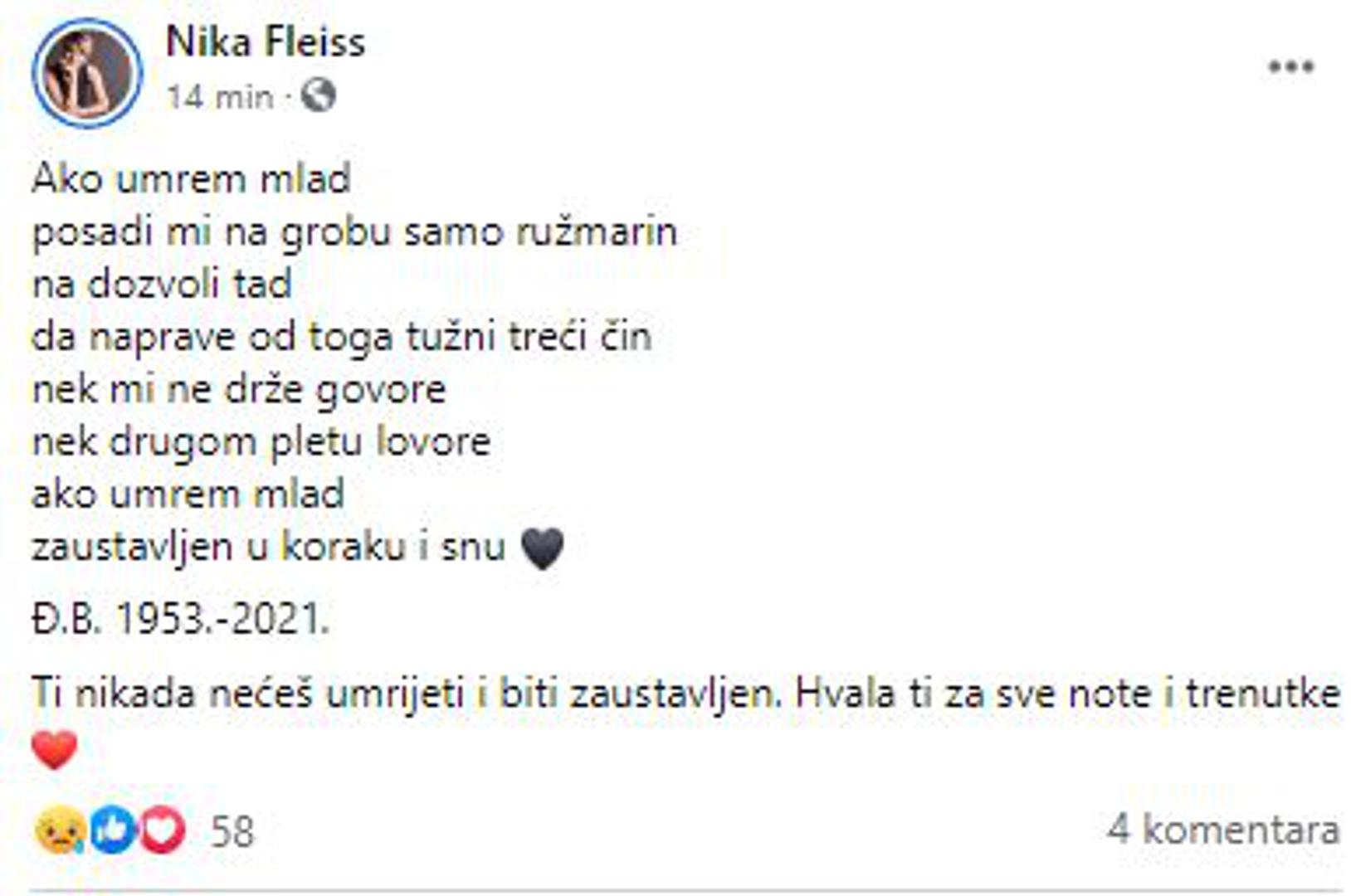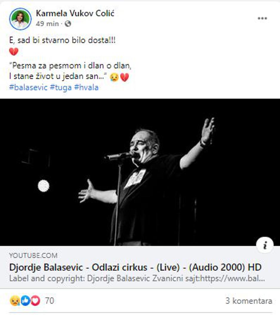 Karmela Vukov-Colić na svom je Facebooku napisala: "E, sad bi stvarno bilo dosta!!!", i podijelila njegove stihove "Pesma za pesmom i dlan o dlan, I stane život u jedan san".