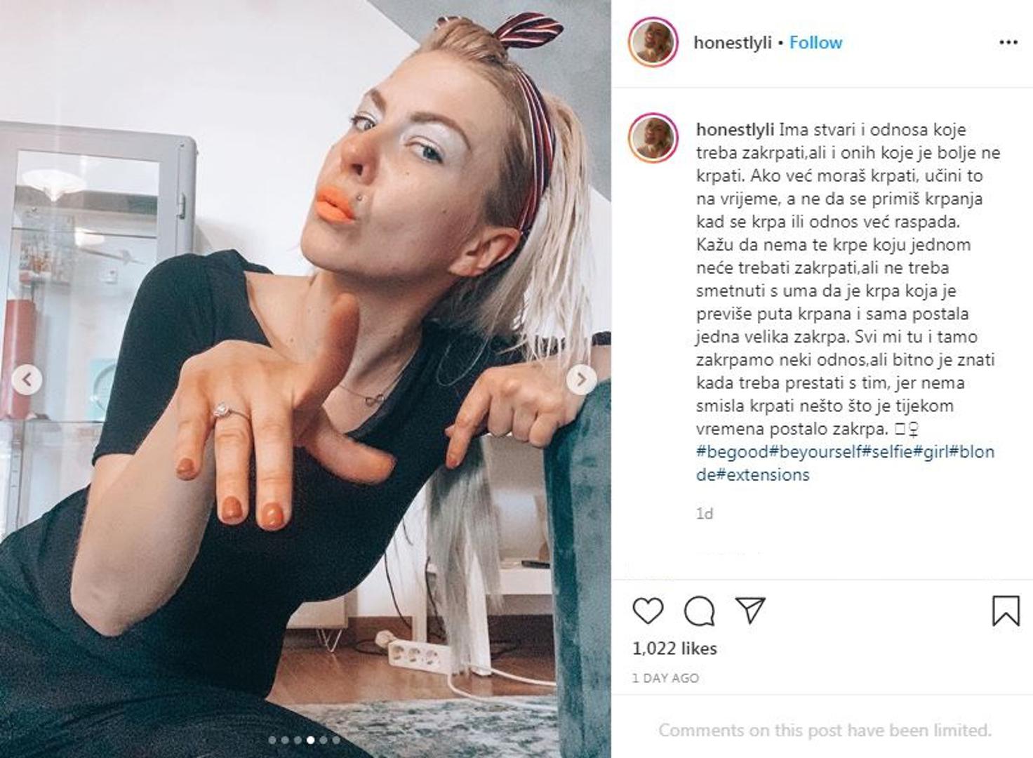 – Ima stvari i odnosa koje treba zakrpati, ali i onih koje je bolje ne krpati. Ako već moraš krpati, učini to na vrijeme, a ne da se primiš krpanja kad se krpa ili odnos već raspada. Kažu da nema te krpe koju jednom neće trebati zakrpati, ali ne treba smetnuti s uma da je krpa koja je previše puta krpana i sama postala jedna velika zakrpa. Svi mi tu i tamo zakrpamo neki odnos, ali je bitno znati kad treba prestati s tim jer nema smisla krpati nešto što je tijekom vremena postalo zakrpa – napisala je Stević.
