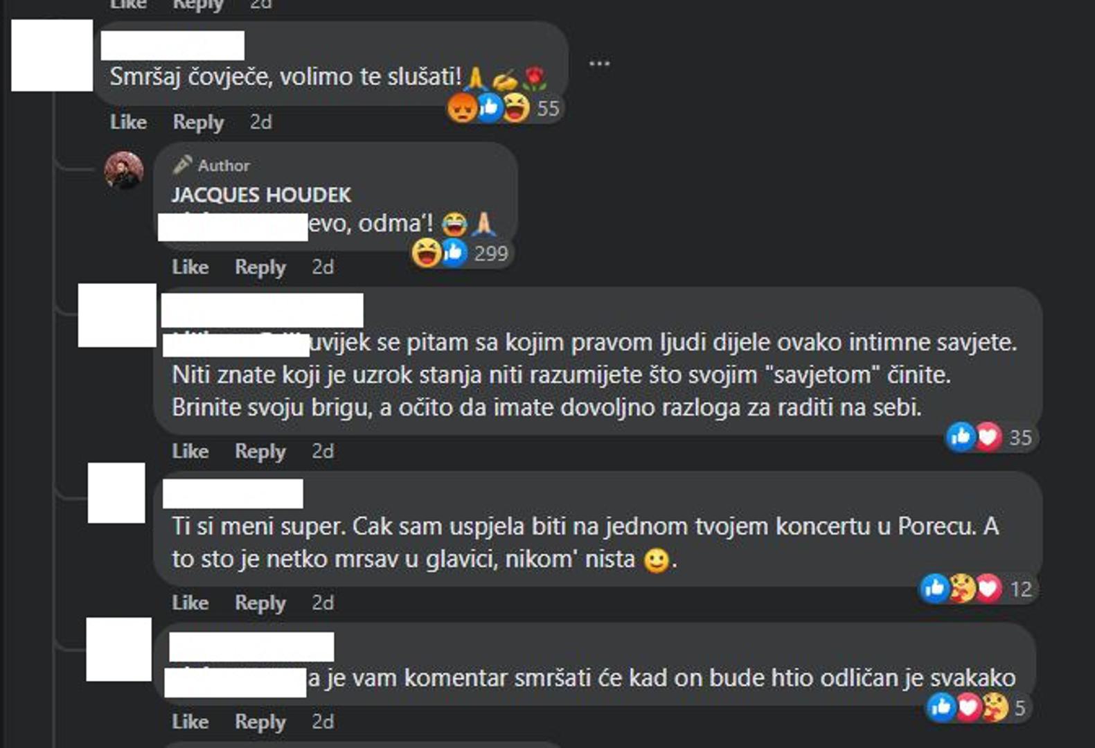 "Uvijek se pitam sa kojim pravom ljudi dijele ovako intimne savjete. Niti znate koji je uzrok stanja niti razumijete što svojim "savjetom" činite. Brinite svoju brigu, a očito da imate dovoljno razloga za raditi na sebi, "Ti si meni super. Čak sam uspjela biti na jednom tvojem koncertu u Poreču. A to sto je netko mršav u glavici, nikom' ništa, "A je vam komentar smršaviti će kad on bude htio odličan je svakako" odgovarali su pratitelji ispod negativnog komentara.