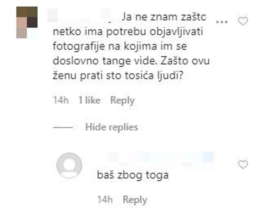 "Ja ne znam zašto netko ima potrebu objavljivati fotografije na kojima im se doslovno tange vide. Zašto ovu ženu prati sto tisuća ljudi?" komentirala je jedna pratiteljica