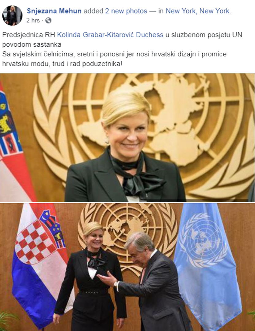 Dizajnerica se pohvalila na Facebooku te uz fotku napisala: "Predsjednica RH Kolinda Grabar-Kitarović u službenom posjetu UN povodom sastanka sa svjetskim čelnicima nosi Duchess. Sretni smo i ponosni jer nosi hrvatski dizajn i promiče hrvatsku modu, trud i rad poduzetnika!"