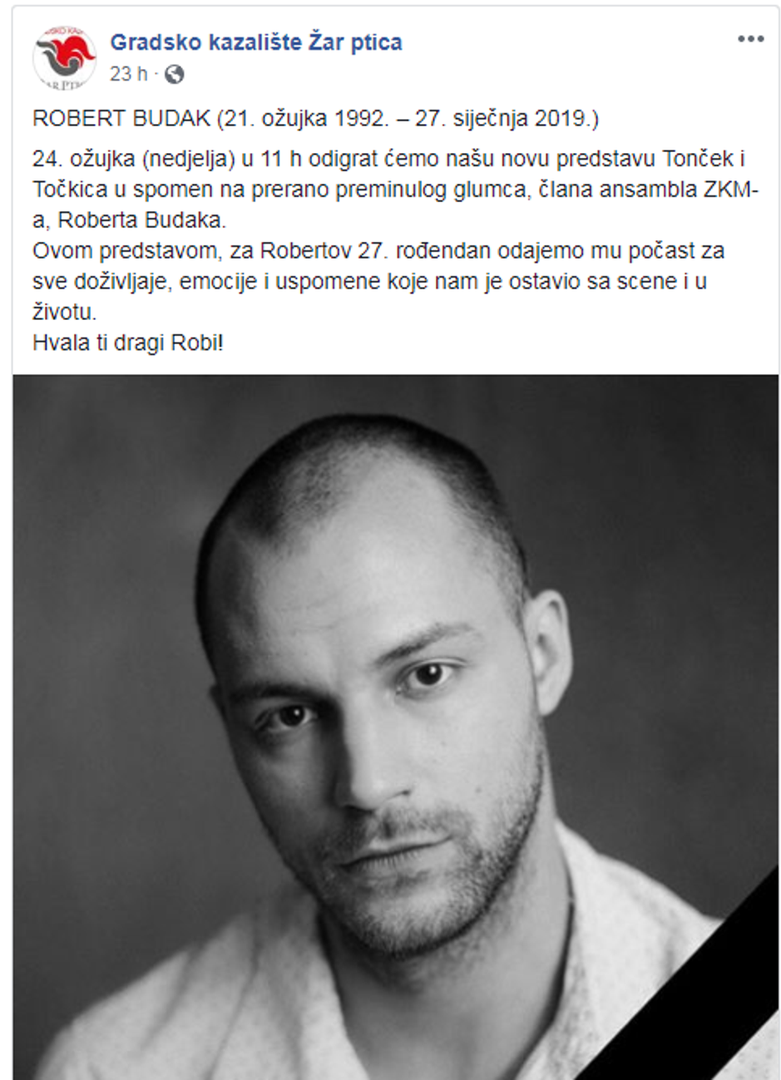 - Ovom predstavom, za Robertov 27. rođendan odajemo mu počast za sve doživljaje, emocije i uspomene koje nam je ostavio sa scene i u životu. Hvala ti dragi Robi - napisali su na Facebooku iz Gradskog kazališta Žar Ptica.