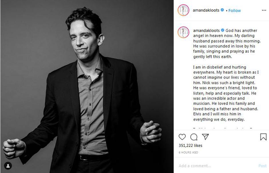 - Bog sada ima još jednog anđela. Moj dragi suprug napustio nas je jutros okružen ljubavi svoje obitelji, pjevajući i moleći da lagano napusti ovaj svijet. Još sam uvijek u nevjerici. Srce mi je slomljeno i ne mogu uopće zamisliti naše živote bez njega. Nick je bio kao sjajno svijetlo. Svima je bio prijatelj, obožavao je slušati, pomagati i posebno razgovarati. Bio je nevjerojatan glumac i glazbenik. Volio je svoju obitelj i volio biti otac i muž. Elvis i meni nedostajat će u svemu što radimo, svakodnevno - napisala je Amanda i uputila i nekoliko riječi zahvale liječniku koji je brinuo o Nicku.