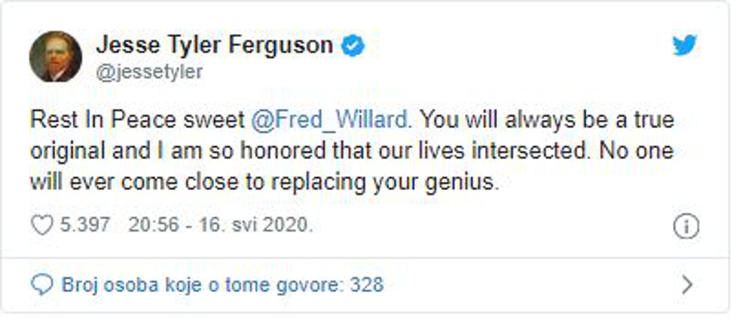 "Počivaj u miru, dragi Frede Willarde. Uvijek ćeš biti pravi original i jako sam počašćen što su se naši životi ukrstili. Nitko neće moći ni blizu zamijeniti tvoju genijalnost", stoji u objavi na Twitteru.