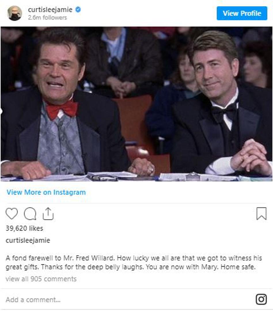 "Zbogom gospodinu Fredu Willardu. Kako samo sretni što smo mogli svjedočiti njegovim velikim talentima. Hvala ti što smo se smijali dok nas trbuh nije zabolio. Sad si sa svojom voljenom Mary" napisla je Jamie, prisjetivši se Fredove supruge koja je preminula dvije godine ranije.