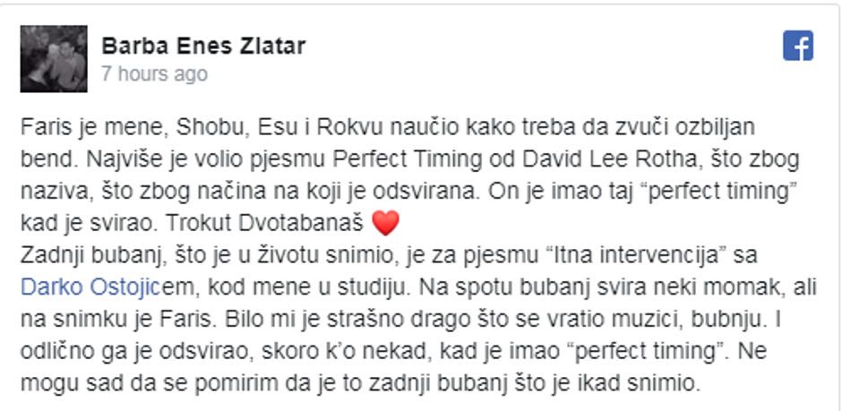 "Faris je mene, Shobu, Esu i Rokvu naučio kako treba da zvuči ozbiljan bend. Najviše je volio pjesmu 'Perfect Timing' od Davida Leeja Rotha, što zbog naziva, što zbog načina na koji je odsvirana. On je imao taj 'perfect timing' kad je svirao. Trokut Dvotabanaš. Zadnji bubanj, što je u životu snimio, je za pjesmu 'Itna intervencija' s Darkom Ostojićem, kod mene u studiju. Na spotu bubanj svira neki momak, ali na snimku je Faris. Bilo mi je strašno drago što se vratio muzici, bubnju. I odlično ga je odsvirao, skoro kao nekad, kad je imao taj 'perfect timing'. Ne mogu sad da se pomirim da je to zadnji bubanj koji je ikad snimio", napisao je na svom Facebook profilu Enes Zlatar.