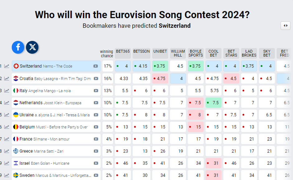 Hrvatski predstavnik na Euroviziji Baby Lasagna i njegova pjesma "Rim Tim Tagi Dim", nakon više od mjesec dana, više nisu na prvom mjestu eurovizijskih kladionica. Naime, Baby Lasagna za favorita na kladionicama glasio je od 29. veljače, a u ponedjeljak ujutro još se nalazio na prvom mjestu sa 16 posto šansi za pobjedu. No, samo nekoliko sati kasnije, Baby Lasagna pao je na drugo mjesto. Na prvom mjestu sada se nalazi predstavnik Švicarske Nemo s pjesmom "The Code". Švicarcu se previđa 17 posto šansi za pobjedu, a preko noći je skočio na kladionicama. Na trećem mjestu kladionica je Talijanka Angelina Mango s pjesmom "La noia". Ona nam je do sad bila najveća konkurencija, a njene šanse su za sad 13 posto.