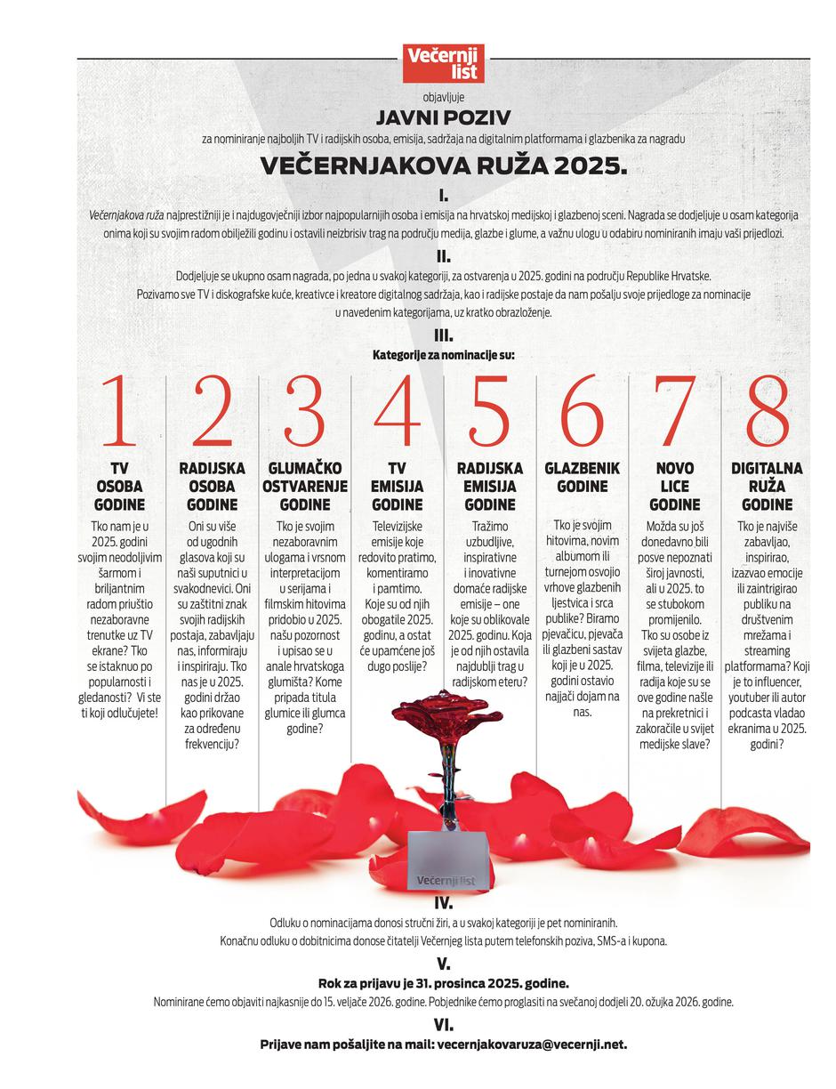 VEČERNJI LIST objavljuje JAVNI POZIV za nominiranje najboljih TV i radijskih osoba, emisija, sadržaja na digitalnim platformama i glazbenika za nagradu VEČERNJAKOVA RUŽA 2025.