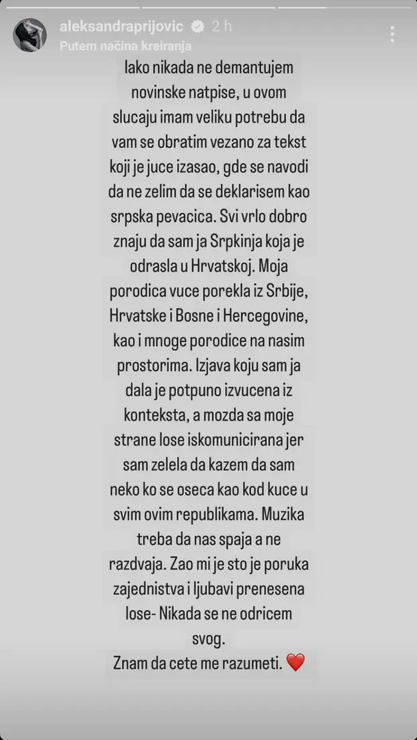 "Iako nikada ne demantiram novinske natpise, u ovom slučaju imam veliku potrebu obratiti se vezano za tekst koji je jučer izašao, gdje se navodi da se ne želim deklarirati kao srpska pjevačica. Svi vrlo dobro znaju da sam ja Srpkinja koja je odrasla u Hrvatskoj. Moja obitelj vuče podrijetlo iz Srbije, Hrvatske, Bosne i Hercegovine, kao i mnoge obitelji na našim prostorima. Izjava koju sam ja dala je potpuno izvučena iz konteksta, a možda s moje strane loše iskomunicirana jer sam željela reći da sam netko tko se osjeća kao kod kuće u svim ovim republikama. Muzika nas treba spajati, a ne razdvajati. Žao mi je što je poruka zajedništva i ljubavi prenesena loše. Nikada se ne odričem svog. Znam da ćete me razumjeti", napisala je na svom Instagram profilu ova pjevačica.