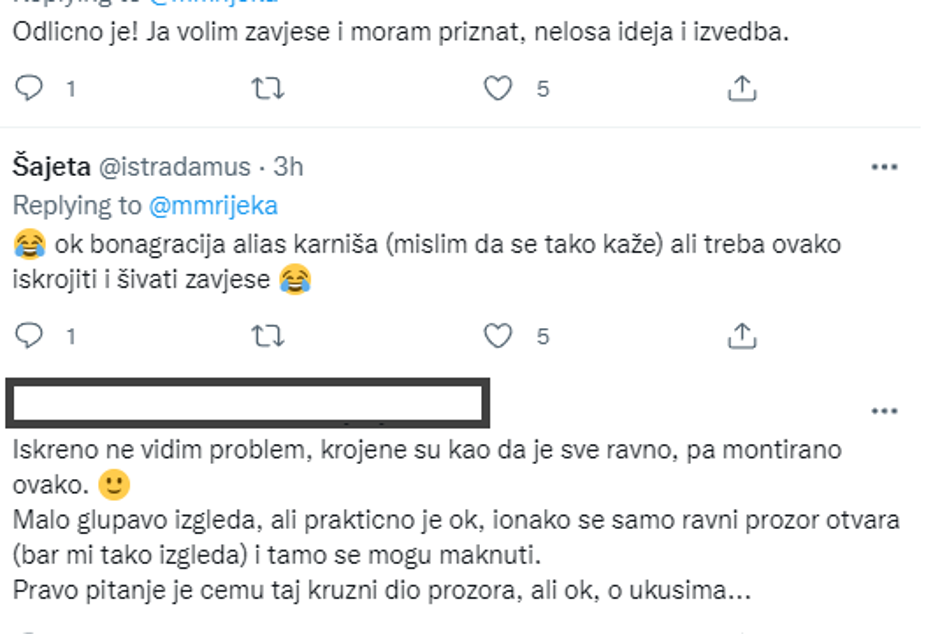 "Odlično je! Ja volim zavjese i moram priznati, neloša ideja i izvedba", napisala je jedna osoba. "Iskreno ne vidim problem, krojene su kao da je sve ravno, pa montirano ovako. Malo glupavo izgleda, ali praktično je ok", "Kako se to opire sili gravitacije?", pisali su drugi, a javio se i Prljin kolega glazbenik Šajeta. "Treba ovako iskrojiti i šivati zavjese", istaknuo je.