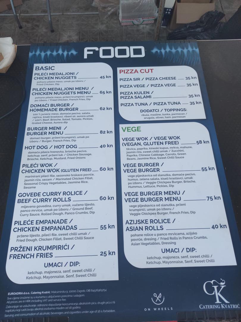 Za one koji su gladni u ponudi je pizza za 35kn, pileći medaljoni za 45kn, cijeli menu za 65kn, pommes frites za 25kn (naravno, s umacima), pileći wok za 60kn, burger za 62kn, a najskuplje u ponudi je burger menu za 82kn.