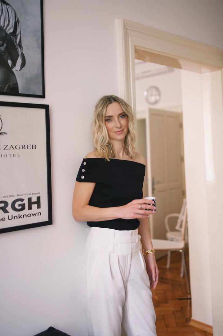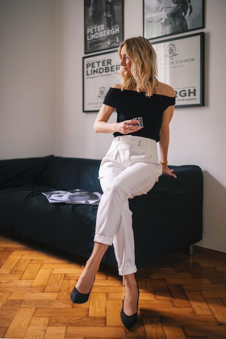 Kao i ponedjeljak, i utorak je dan obilježen poslovnim obavezama, sastancima i pripremama projekata. Marina odjevna kombinacija savršen je odabir za proljetni dan ispunjen obavezama, a ona je odlučila provesti ga u elegantnim bijelim hlačama visokog struka i crnom topu.