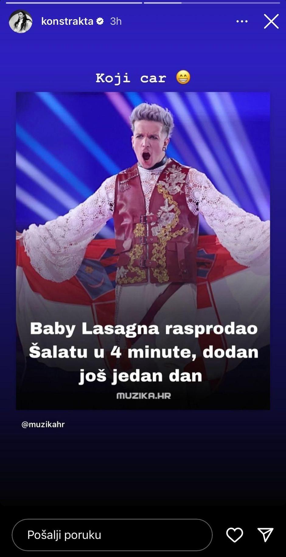 Veliki uspjeh Baby Lasagne na društvenoj mreži Instagram prokomentirala je i srpska bivša predstavnica na Euroviziji Konstrakta. - Koji car - napisala je na svojoj Instagram priči ova glazbenica. Konstrakta je prošle godine predstavljala Srbiju na Euroviziji s pjesmom "In corpore sano" te također pridobila velike simpatije hrvatske publike. Ove je godine čitala glasove srpskog žirija, a koji je našem predstavniku dao 12 bodova. Konstrakta je prilikom čitanja bodova pokazala i tabletić.