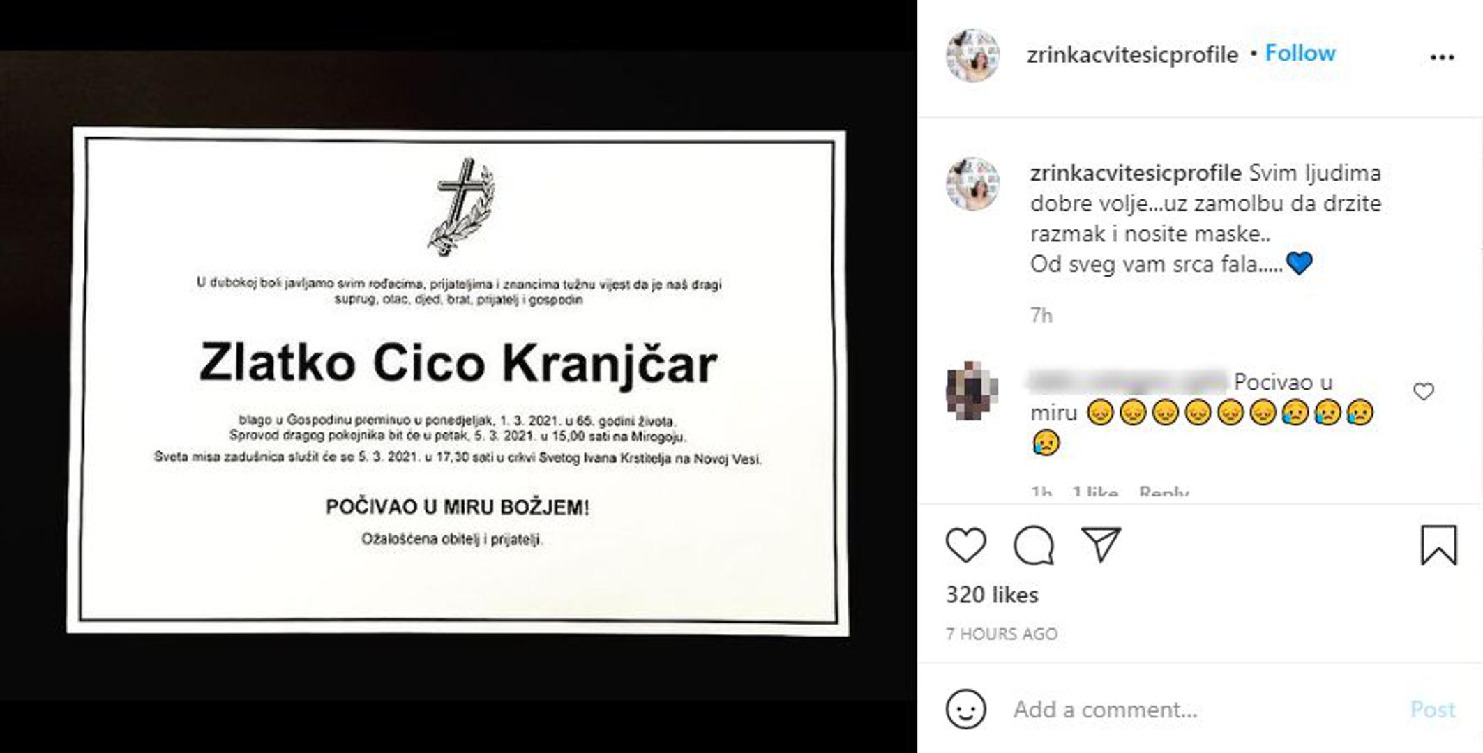"Svim ljudima dobre volje... uz zamolbu da držite razmak i nosite maske.. Od sveg vam srca fala...", napisala je kratko uz fotografiju osmrtnice koja sadrži informacije o današnjem sprovodu sportskog velikana koji je nakon kratke i teške bolesti preminuo početkom ovog tjedna u KBC-u Merkur.