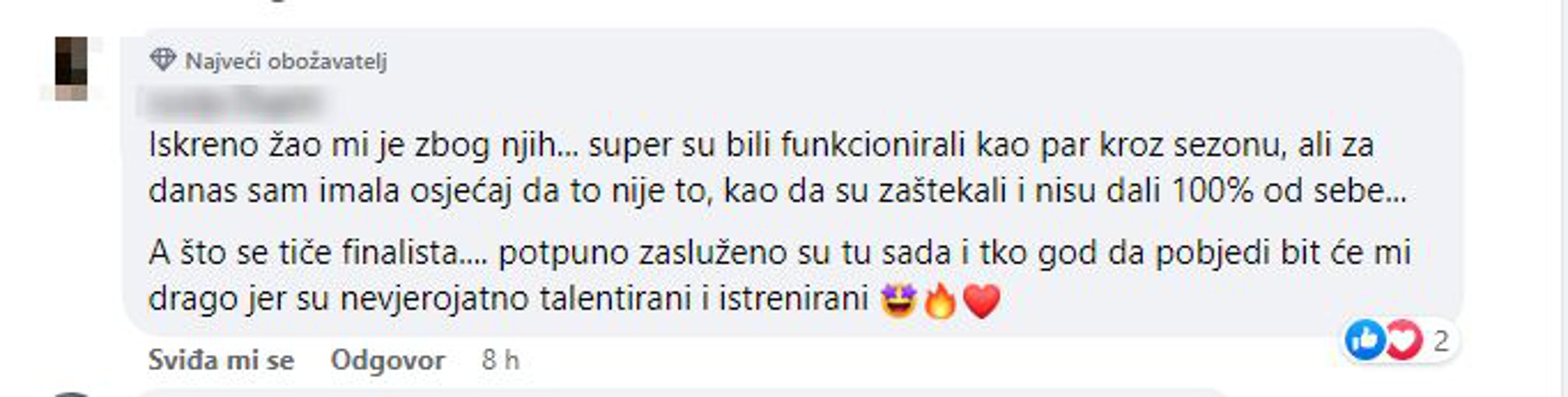 - Iskreno žao mi je zbog njih... super su bili funkcionirali kao par kroz sezonu, ali za danas sam imala osjećaj da to nije to, kao da su zaštekali i nisu dali 100 posto od sebe... A što se tiče finalista.... Potpuno zasluženo su tu sada i tko god da pobjedi bit će mi drago jer su nevjerojatno talentirani i istrenirani - napisala je korisnica Facebooka.