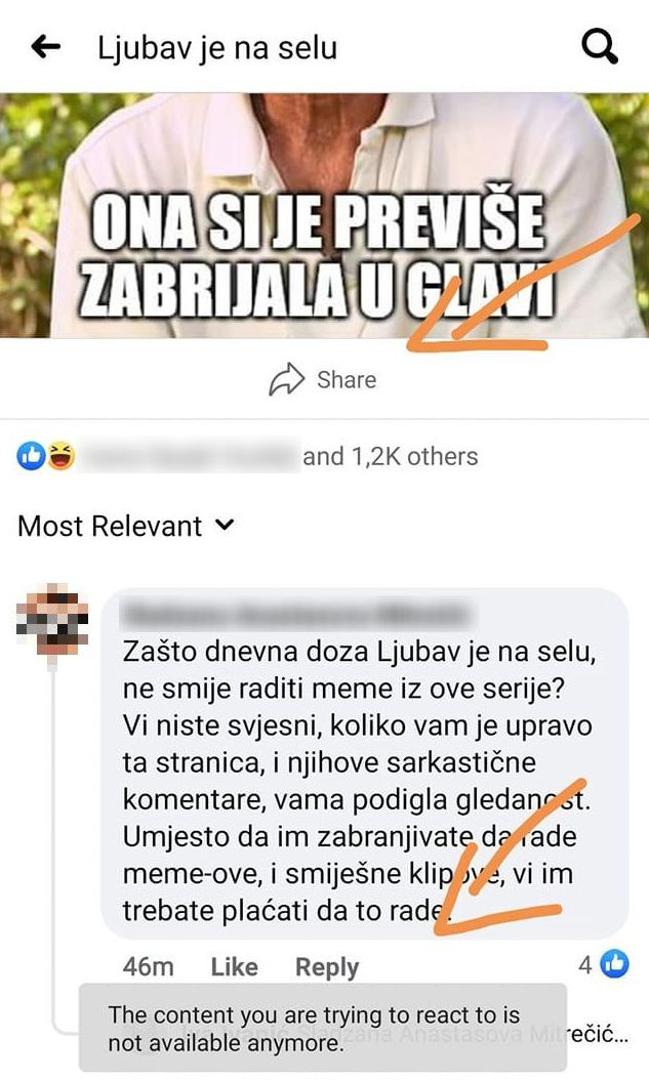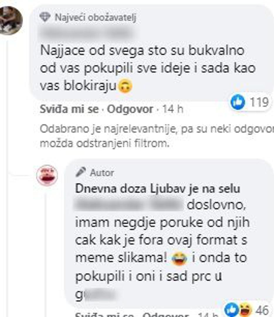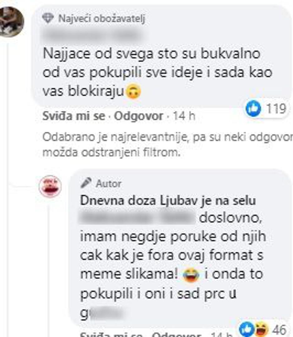 - Vi niste svjesni koliko su vam ova stranica i njihovi sarkastični komentari podigli gledanost. Umjesto da im zabranjujete da rade memeove i smiješne klipove, vi im trebate plaćati da to rade, napisala im je jedna gledateljica, no i taj je komentar brzo nestao sa stranice, a ona je blokirana.