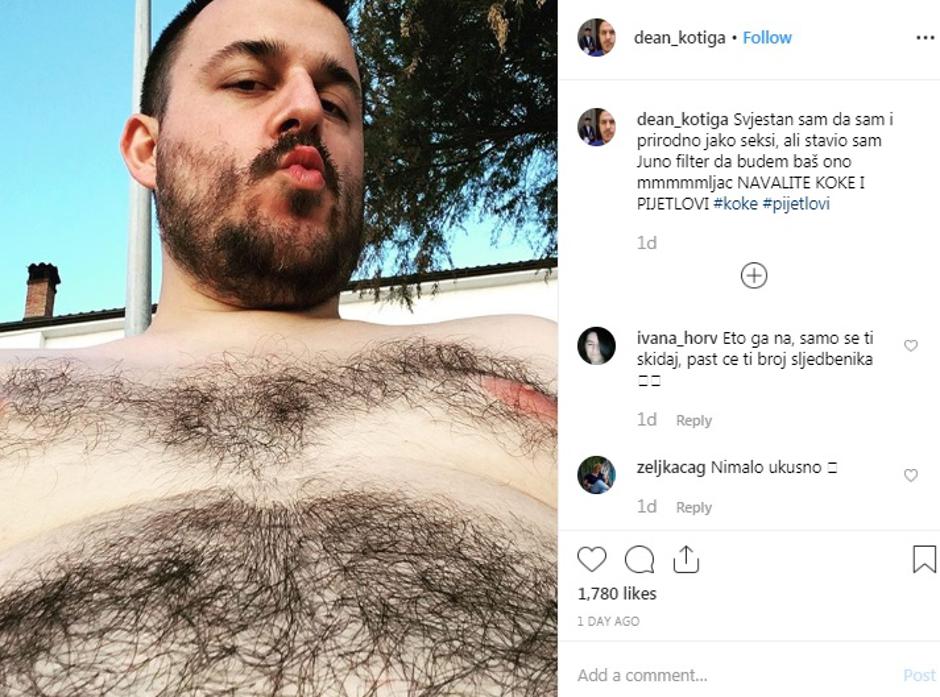- Svjestan sam da sam i prirodno jako seksi, ali stavio sam Juno filter da budem baš ono mmmmmljac! NAVALITE KOKE I PIJETLOVI - napisao je Kotiga u opisu fotografije i nasmijao brojne obožavatelje. No, neki od njih zamjerili su mu dlake na prsima pa je tako Dean ostao u kratkom roku bez tisuću pratitelja na Instagramu.