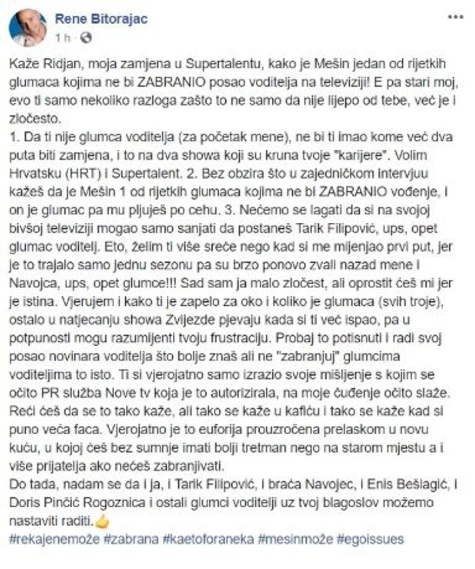 Vjerujem i kako ti je zapelo za oko i koliko je glumaca (svih troje), ostalo u natjecanju showa Zvijezde pjevaju kada si ti već ispao, pa u potpunosti mogu razumjeti tvoju frustraciju. Probaj to potisnuti i radi svoj posao novinara voditelja što bolje znaš ali ne "zabranjuj" glumcima voditeljima to isto. Ti si vjerojatno samo izrazio svoje mišljenje s kojim se očito PR služba Nove tv koja je to autorizirala, na moje čuđenje očito slaže. Reći ćeš da se to tako kaže, ali tako se kaže u kafiću i tako se kaže kad si puno veća faca. Vjerojatno je to euforija prouzročena prelaskom u novu kuću, u kojoj ćeš bez sumnje imati bolji tretman nego na starom mjestu a i više prijatelja ako nećeš zabranjivati. Do tada, nadam se da i ja, i Tarik Filipović, i braća Navojec, i Enis Bešlagić, i Doris Pinčić Rogoznica i ostali glumci voditelji uz tvoj blagoslov možemo nastaviti raditi", napisao je Rene.