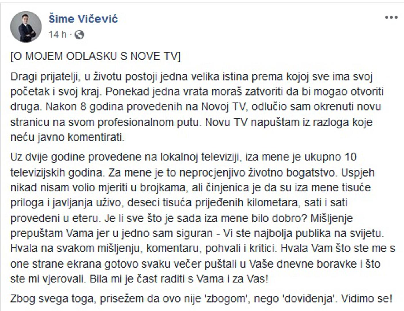 Nešto kasnije napuštanje Nove TV prokomentirao je i na svom Facebook profilu. – Dragi prijatelji, u životu postoji jedna velika istina prema kojoj sve ima svoj početak i svoj kraj. Ponekad jedna vrata moraš zatvoriti da bi mogao otvoriti druga. Nakon 8 godina provedenih na Novoj TV, odlučio sam okrenuti novu stranicu na svom profesionalnom putu. Novu TV napuštam iz razloga koje neću javno komentirati – započeo je Vičević koji se redakciji Nove TV pridružio 2011. godine i to nakon što je svoj profesionalan put započeo na lokalnoj televiziji Vox.