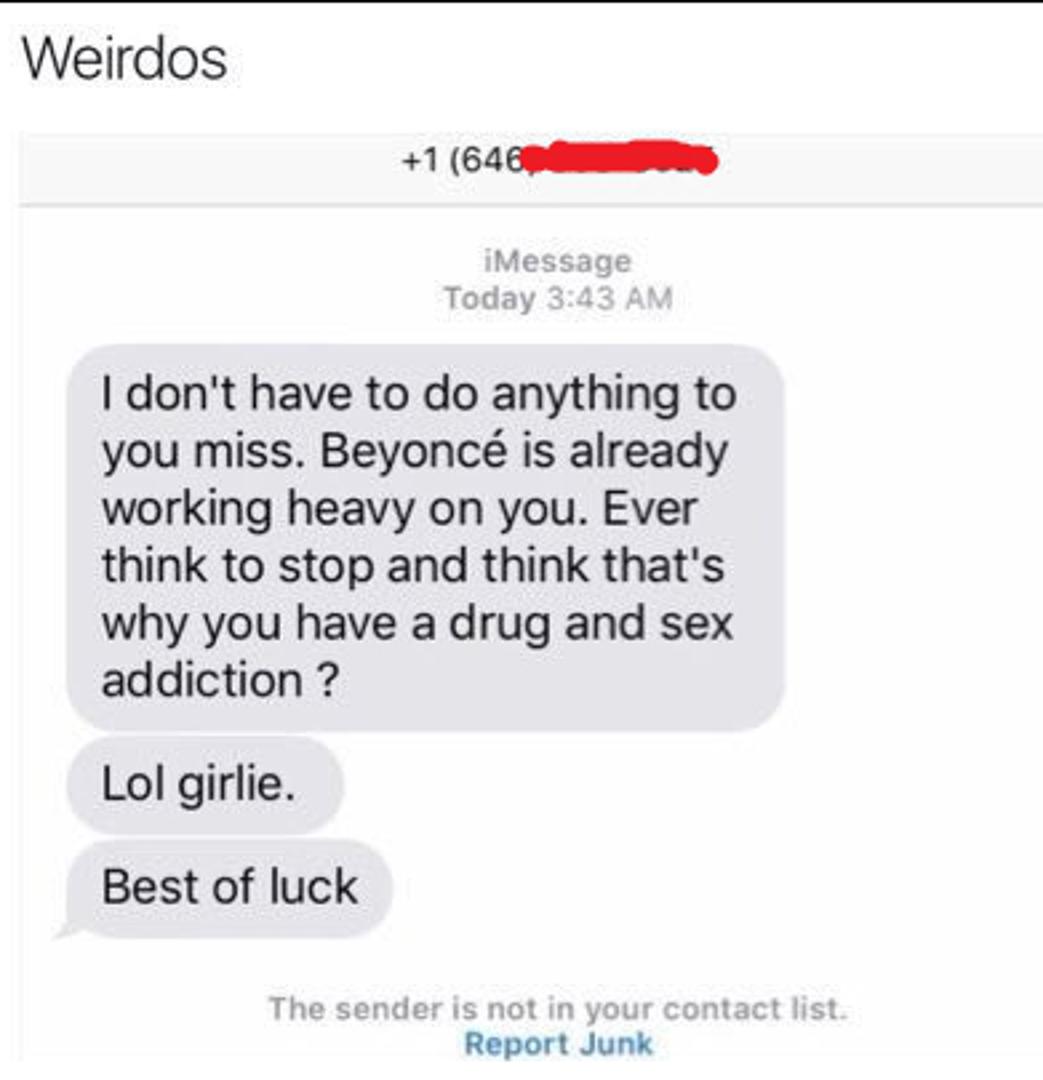 - Nemam ništa s tobom, gospođice. Beyonce te je ionako već sredila. Nisi nikad mislila prestati s ovim i možda razmisliti da si zato ovisnik o seksu i alkoholu - pisalo je u poruci.