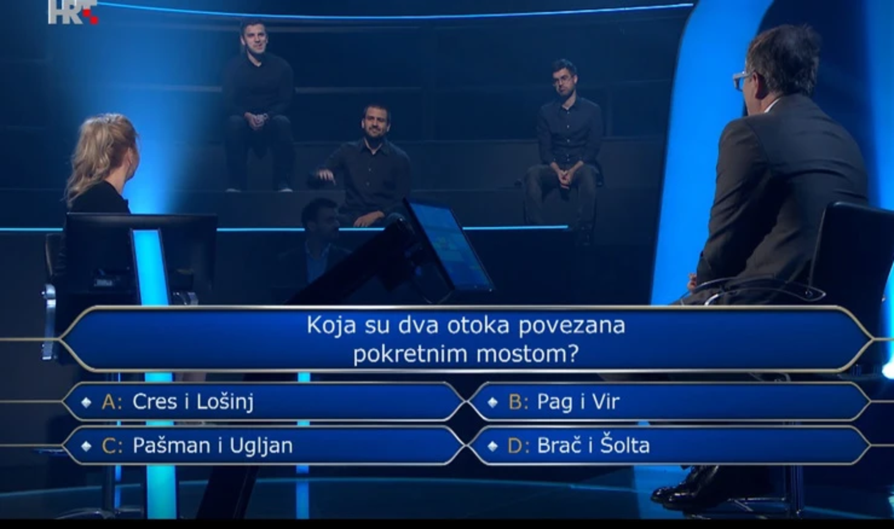 Prvotno se odlučila za džoker "zovi" jer je konstatirala da joj opcija "pola-pola" ne bi pomogla. Ipak je na kraju prihvatila prijedlog voditelja i upitala znalca Brunu. On nije bio u potpunosti siguran i ponudio je odgovor Pašman i Ugljan, ali također je i savjetovao natjecateljici da njegov odgovor možda potvrdi još nekim džokerom, prenosi HRT.