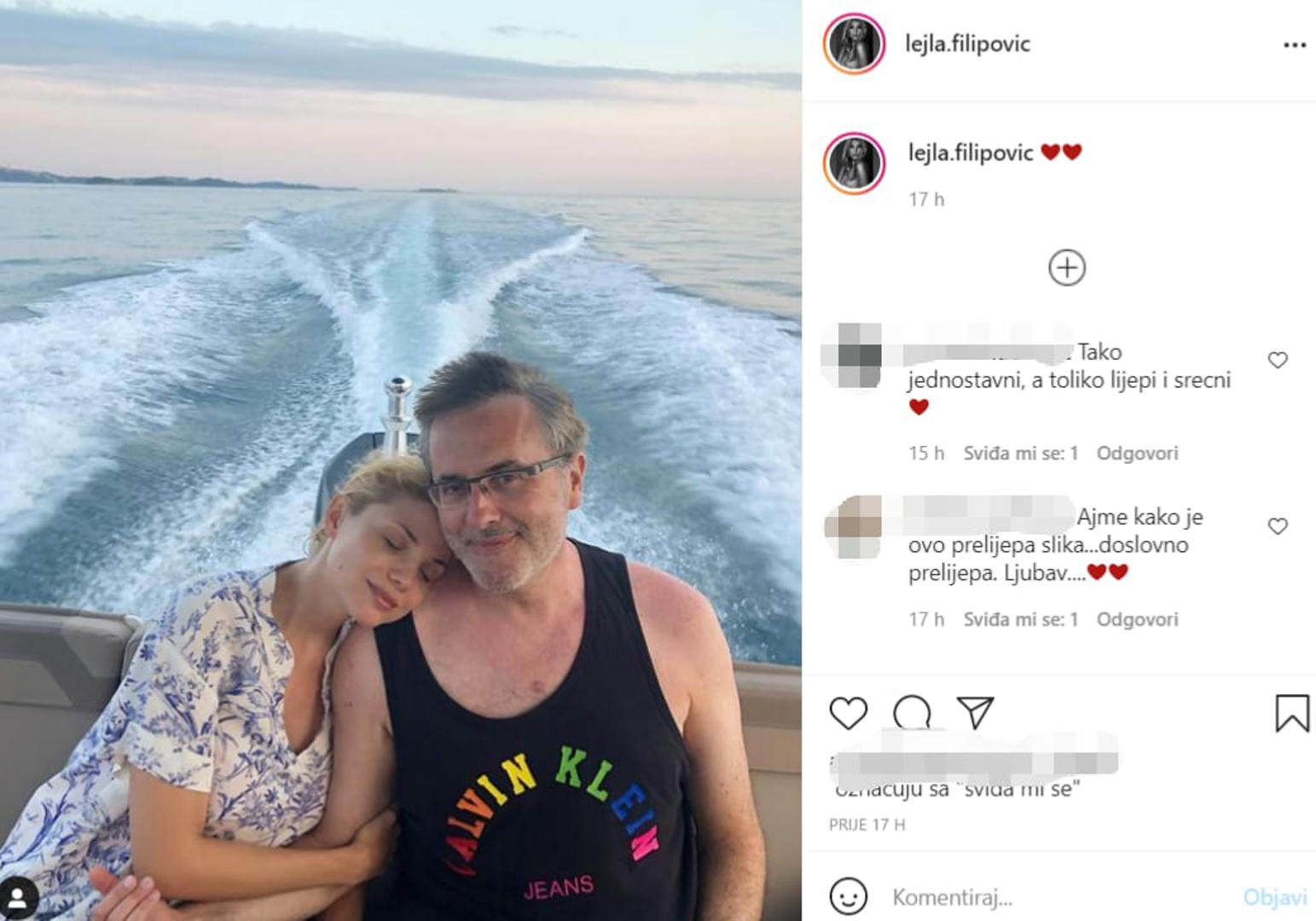 Bivša Miss Hrvatske Lejla Filipović (44) i njezin suprug, voditelj i glumac Tarik (49) trenutno uživaju na odmoru, a ona je tom prilikom na svojem Instagram profilu podijelila jednu romantičnu fotografiju. Par na fotografiji uživa u zagrljaju dok plove morem, a u opis je Lejla stavila samo nekoliko emotikona srca.