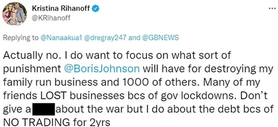 Ruska plesačica Kristina Rihanoff (44), koja se proslavila sudjelovanjem u BBC-jevom showu Strictly Come Dancing, objavila je na društvenim mrežama objavu u kojoj je između ostalog napisala da je boli briga za rat. Iako je objavu ubrzo obrisala, mnogi su ga screenshotali, zbog čega je Kristina objavila ispriku.