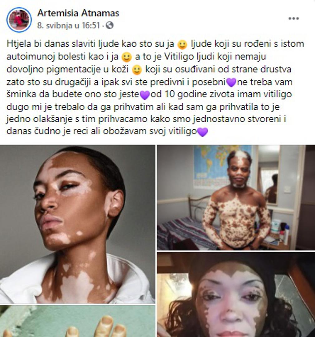 "Htjela bih danas slaviti ljude kao što sam ja. Ljude koji su rođeni s istom autoimunom bolesti kao i ja, a to je vitiligo. Ljudi koji nemaju dovoljno pigmentacije u koži, koji su osuđivani od društva zato što su drukčiji, a ipak svi ste predivni i posebni. Ne treba vam šminka da budete ono što jeste. Od 10. godine života imam vitiligo. Dugo mi je trebalo da ga prihvatim, ali kad sam ga prihvatila, to je jedno olakšanje. Danas mi je čudno reći, ali obožavam svoj vitiligo", zaključila je Samanta.
