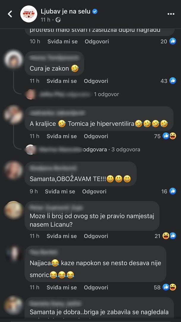 ''Tomica je hiperventilirao'' i ''Napokon se nešto dešava, nije smorić'' samo je dio Samantinih komentara koji su nasmijali gledatelje te poručili kako ''treba dobiti svoju emisiju da valja fore'' te jedva čekaju novu epizodu u ponedjeljak kako bi čuli njezine komentare.