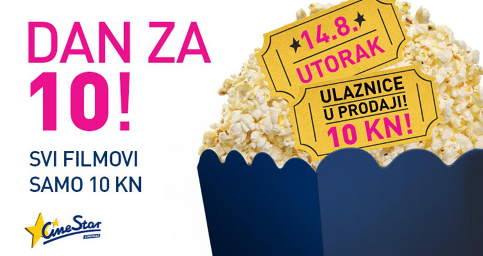 Sredina kolovoza najčešće je vrijeme godišnjih odmora, ali u većem slučaju i vrijeme laganog povratka s istih. Tko kaže da ljeto u vašem gradu mora biti neispunjeno i monotono? Za sve ljubitelje velikog platna i najukusnijih kokica, CineStar je i ovoga ljeta pripremio neodoljivu priliku koja se ne propušta. U utorak, 14.08., 'CineStar dan za 10', najbolji je kino dan u godini i savršena je prilika za pogledati najnovije naslove po posebnoj cijeni od 10 kuna po ulaznici. Idealna prilika za druženje uz raznovrsne žanrove i omiljene glumce definitivno će zaokružiti i ispuniti ljeto i slobodno vrijeme.