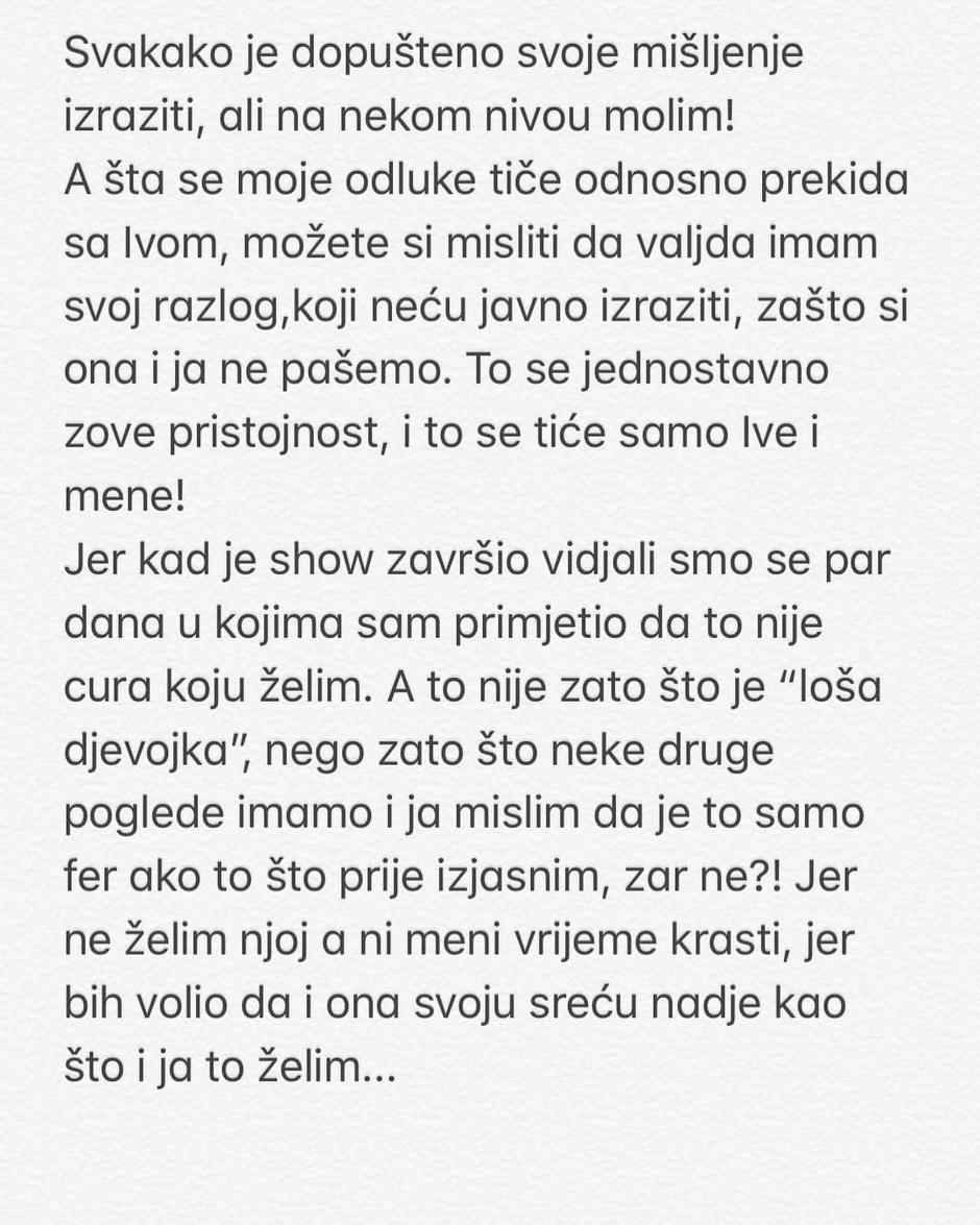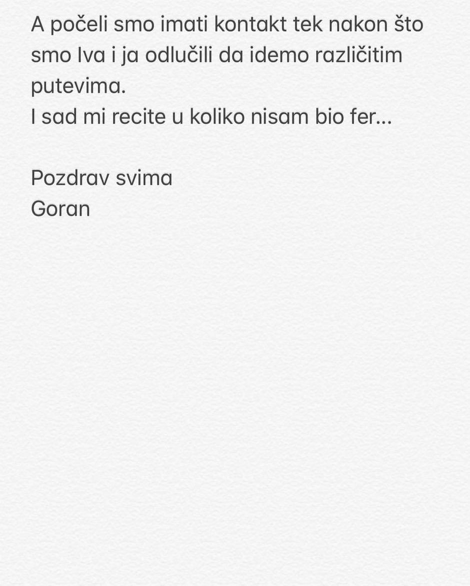 Zbog prekida s Ivom i početka romanse s Hanom, Gorana su mnogi osudili. Bilo je tu i uvreda, a on je konačno odlučio prekinuti šutnju i objasniti obrat koji se dogodio na samom kraju emisije. Na svom InstaStoryju objavio je podužu poruku u kojoj objašnjava svima što se točno zbivalo.