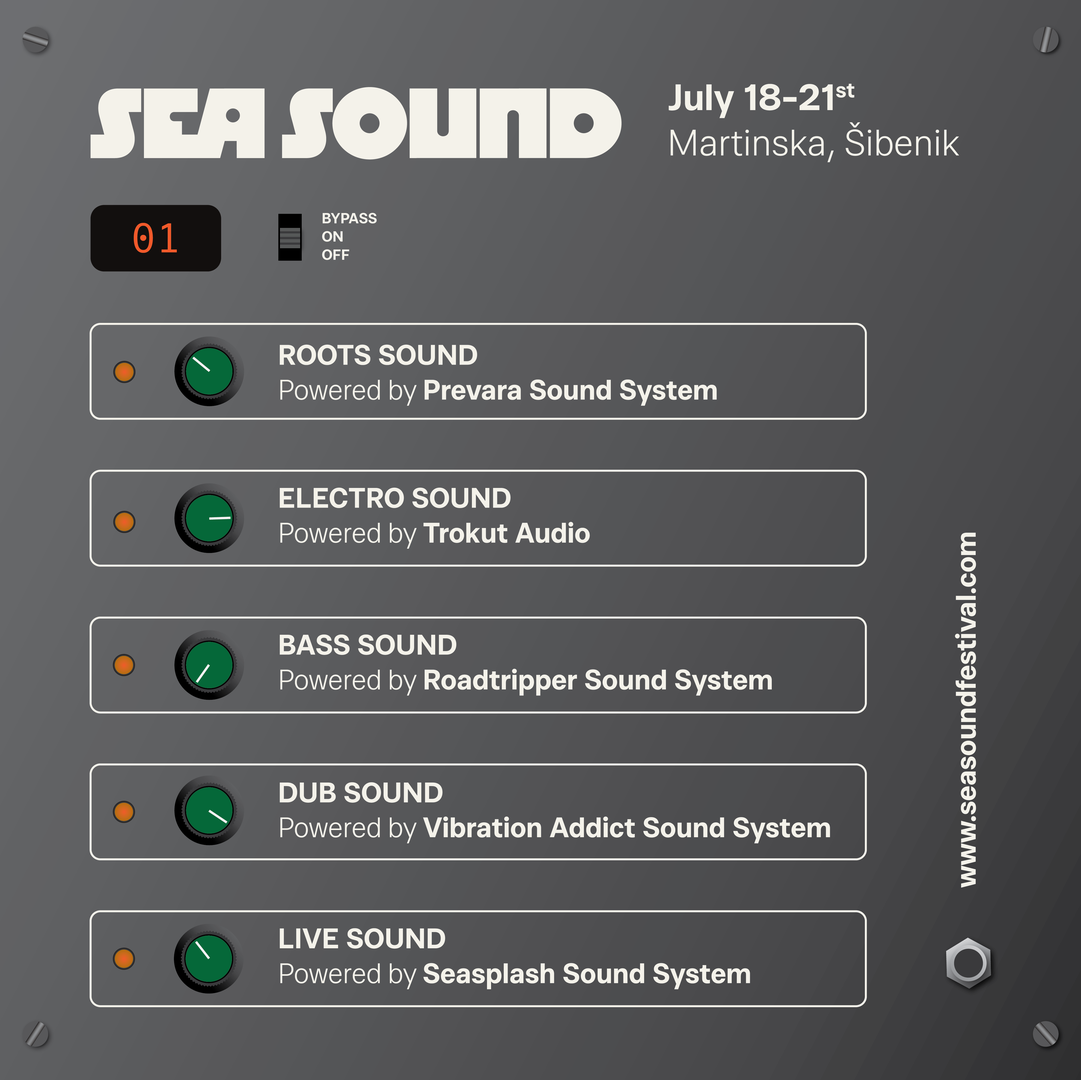 Sea Sound festival osmišljen je kao jedinstveno glazbeno događanje, svojevrsno utopijsko sound system "selo", koje će svojim posjetiteljima predstaviti više zasebnih, ali ipak povezanih floorova. Njegova posebnost je baš u tome što će se, od 18. do 21. srpnja na lokaciji Martinske u Šibeniku, na pet većih, srednjih i manjih pozornica, čitav program odvijati upravo na ‘custom made’ sound systemima.