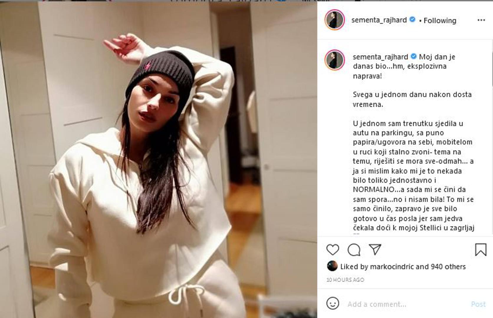 -Moj dan je danas bio...hm, eksplozivna naprava! Svega u jednom danu nakon dosta vremena. U jednom sam trenutku sjedila u autu na parkingu, sa puno papira/ugovora na sebi, mobitelom u ruci koji stalno zvoni- tema na temu, riješiti se mora sve-odmah... a ja si mislim kako mi je to nekada bilo toliko jednostavno i NORMALNO...a sada mi se čini da sam spora...no i nisam bila! To mi se samo činilo, zapravo je sve bilo gotovo u čas posla jer sam jedva čekala doći k mojoj Stellici u zagrljaj - napisala je Sementa.