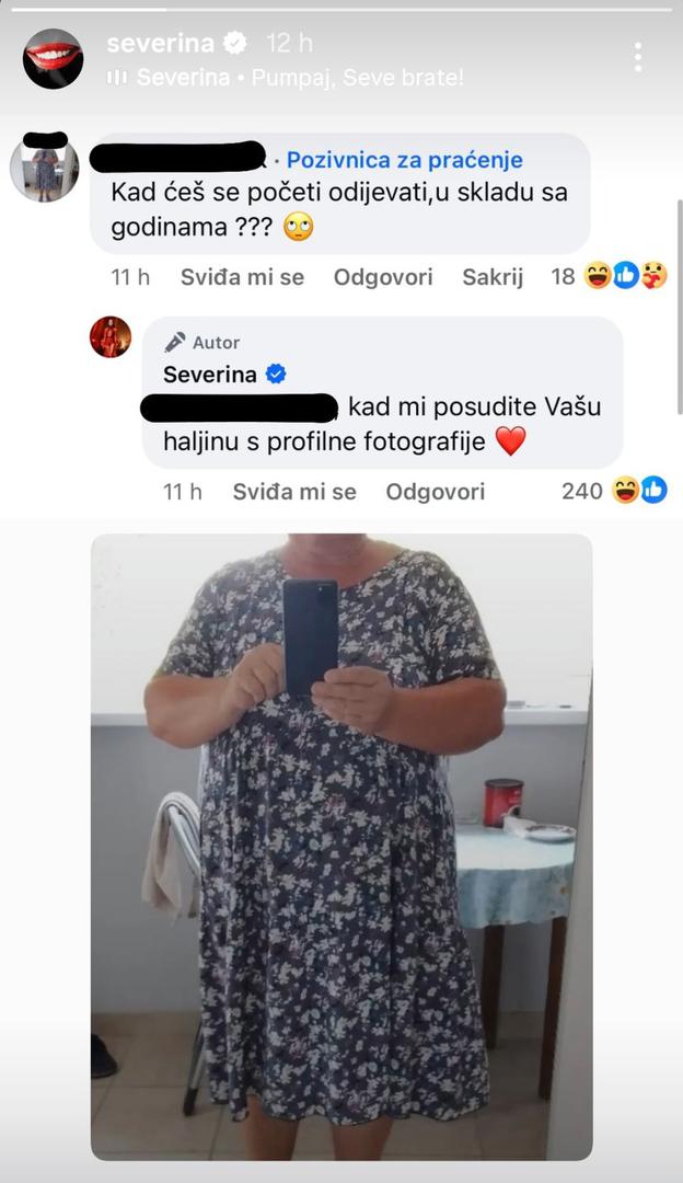 Severina Vučković (53) godinama slovi za jednu od najbolje odjevenih domaćih pjevačica. Poznata je po tome što prati svjetske modne trendove, ali istovremeno ih sjajno uklapa u vlastiti modni izričaj, no kako su ukusi različiti povremeno se nađe i na meti kritika onih kojima se ne sviđa njezin način odijevanja. A kako je atraktivna pjevačica aktivna i na društvenim mrežama upravo je to mjesto na kojemu komunicira sa svojim obožavateljima. A posljednjim komentarom nasmijala je mnoge. Naime, jedna pratiteljica ju je pitala kada se planira početi odijevati u skladu sa svojim godinama, na što je Seve odgovorila: Kada mi posudite vašu haljinu s profilne fotografije.