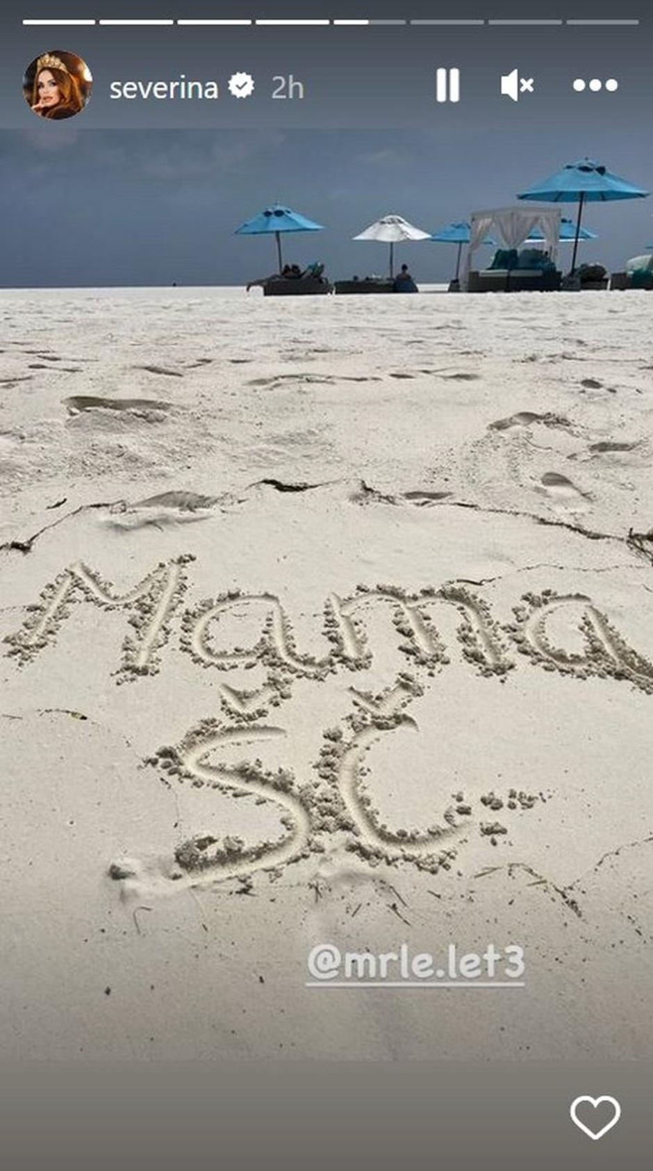 Podrška riječkoj skupini Let 3 ne prestaje pristizati nakon pobjede na ovogodišnjoj Dori. Njihova pjesma 'Mama ŠČ!' neprestano izaziva reakcije na društvenim mrežama, a među onima koji su zadovoljni našim ovogodišnjim predstavnicima na Euroviziji je i Severina (50). Splitska pjevačica trenutno odmara na Maldivima u društvu svog dugogodišnjeg suradnika Tomice Petrovića i sina Aleksandra, a svojim je kolegama poslala poruku iz egzotičnih krajeva. Naime, Severina je na Instagramu objavila fotografiju na kojoj je u pijesku ispisan naziv pobjedničke pjesme 'Mama ŠČ', a u objavi je označila i Damira Martinovića Mrleta.
