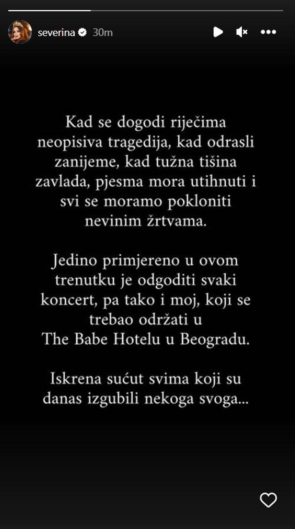 - Kada se dogodi riječima neopisiva tragedija, kada odrasli zanijeme, kada tužna tišina zavlada, pjesma mora utihnuti i svi se moramo pokloniti nevinim žrtvama - stoji u statusu koji je podijelila Severina i dodala: