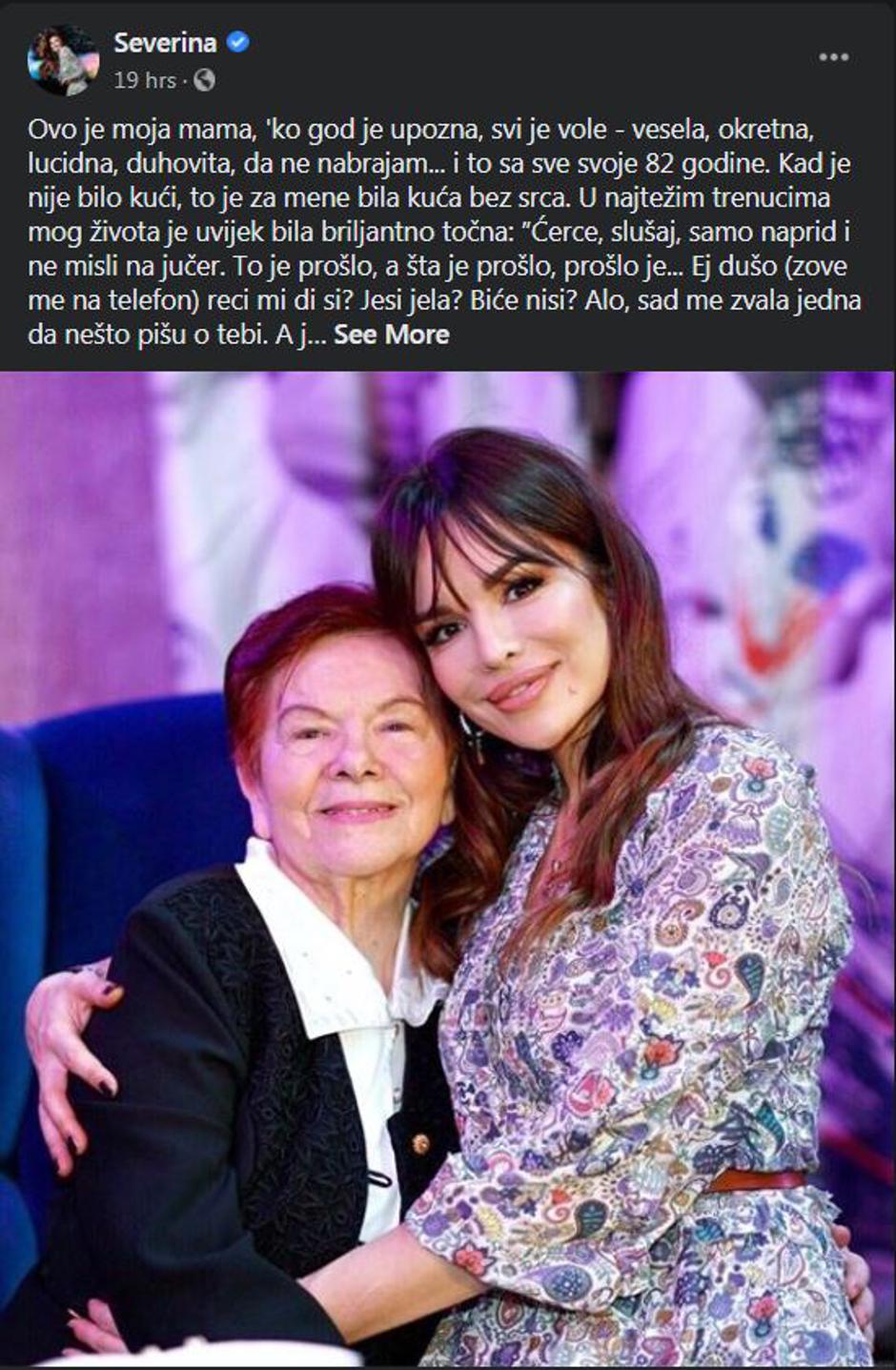 “A nekidan jedna u busu kaže nešto Severina. I ja pitam: 'Šta Severina?' A ona kaže: 'A ali je vi poznajete?' Na to ću ja: 'Jesam, od malih nogu je znan.' Slušaj, ćerce, ti znaš ‘ko si i mater zna i da se cili svit okrene protiv, onaj gore zna. A znaš i ti i viruj u sebe, jesi me čula? Nego, di mi je unuk? Daj mi dite na telefon… Aloo, baba je, muzuviru moj….”, napisala je pjevačica.